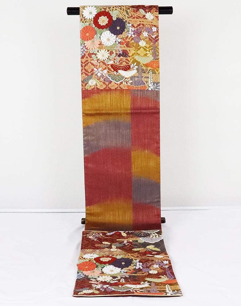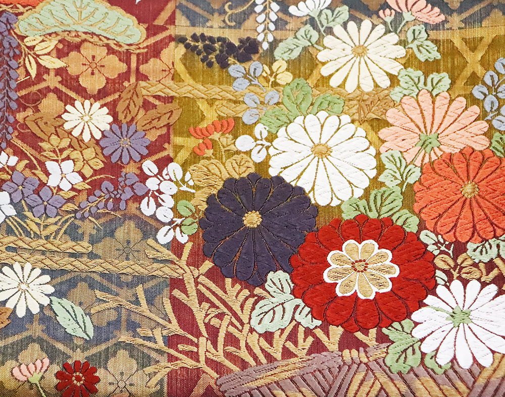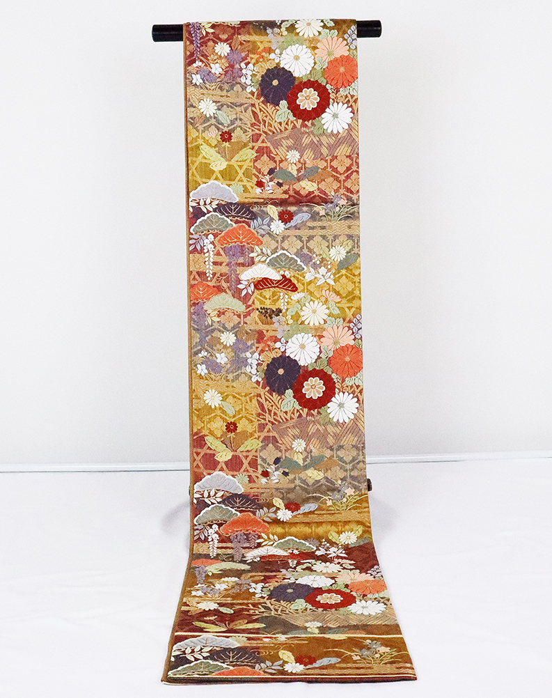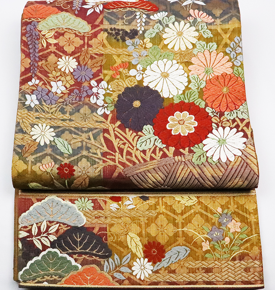 | 西陣織袋帯 唐織 金茶・赤紫・紫地 唐織 松竹梅・菊・桔梗・萩・柴垣 新品 仕立て上がり | |
