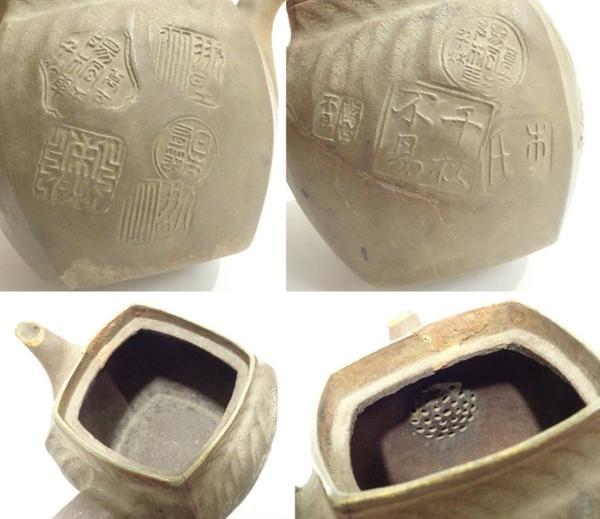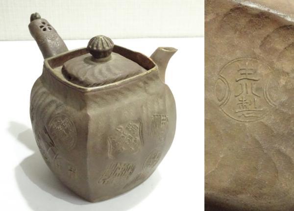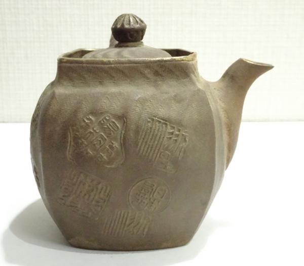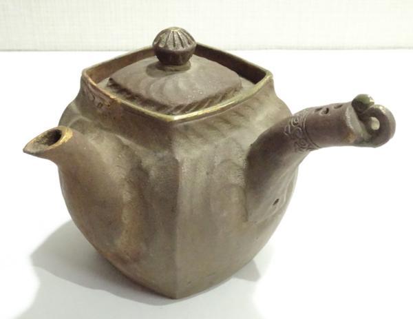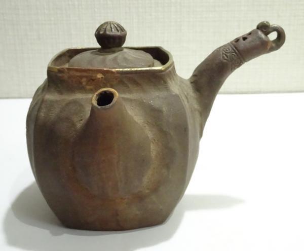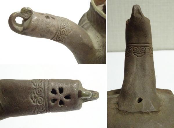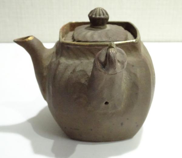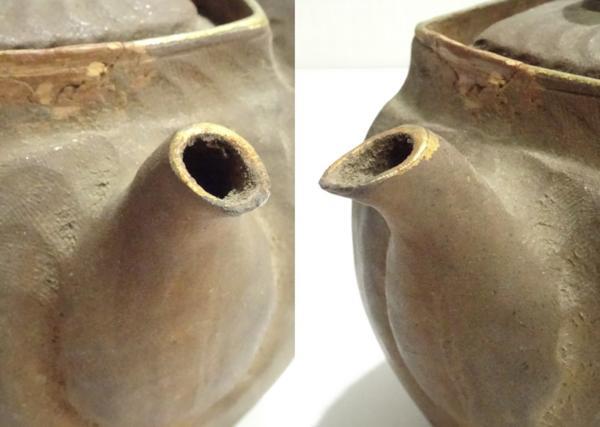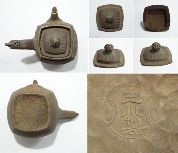 素材:木製、土製。持ち手含む横10.8cm×蓋含む高さ8.3cm×注ぎ口含む奥行き9cm。写真9枚目のように蓋の受け部分に直しあります。