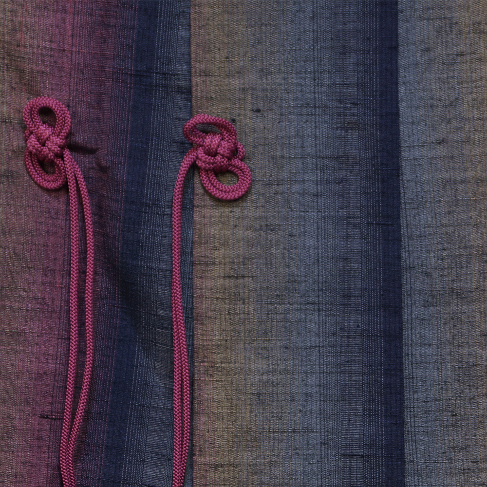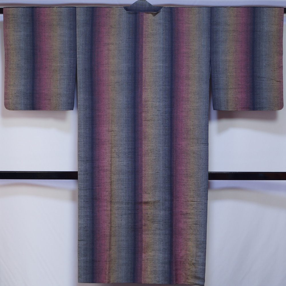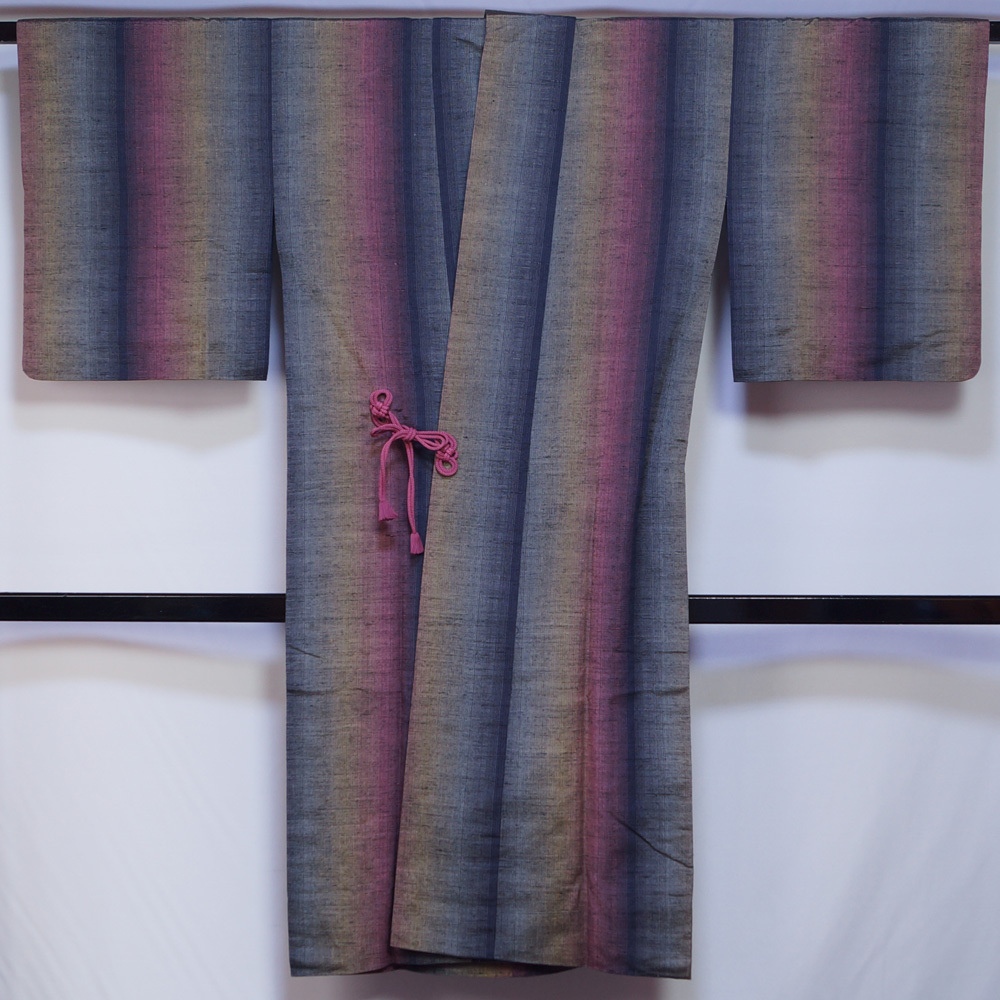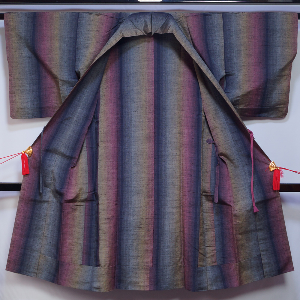 | 商品説明 | 濃紺・山葵・紅色などのぼかし縞模様が織られたロング丈の道中着です。 ※状態良好です。 |
