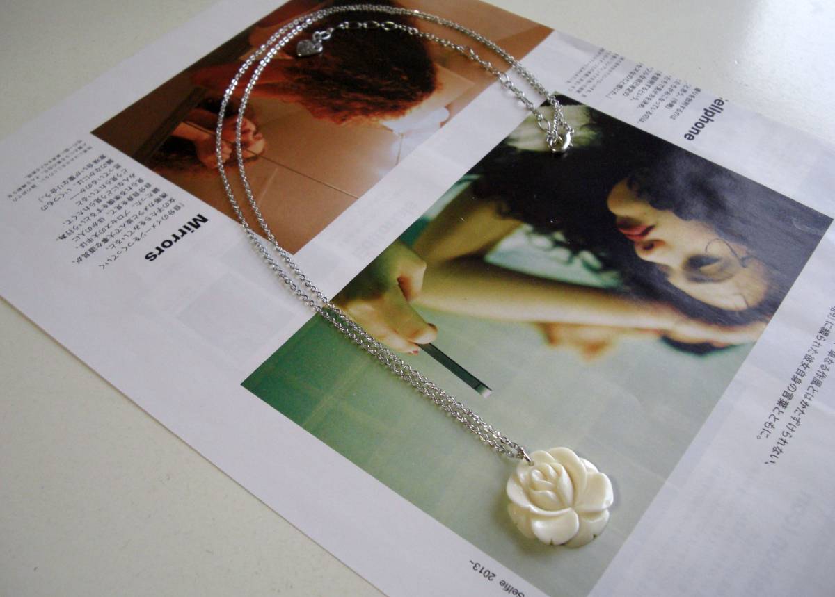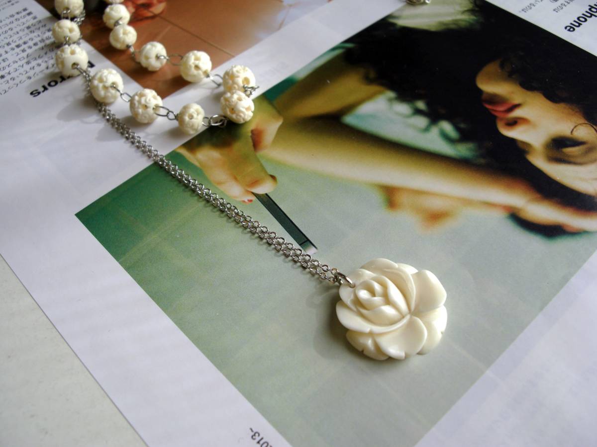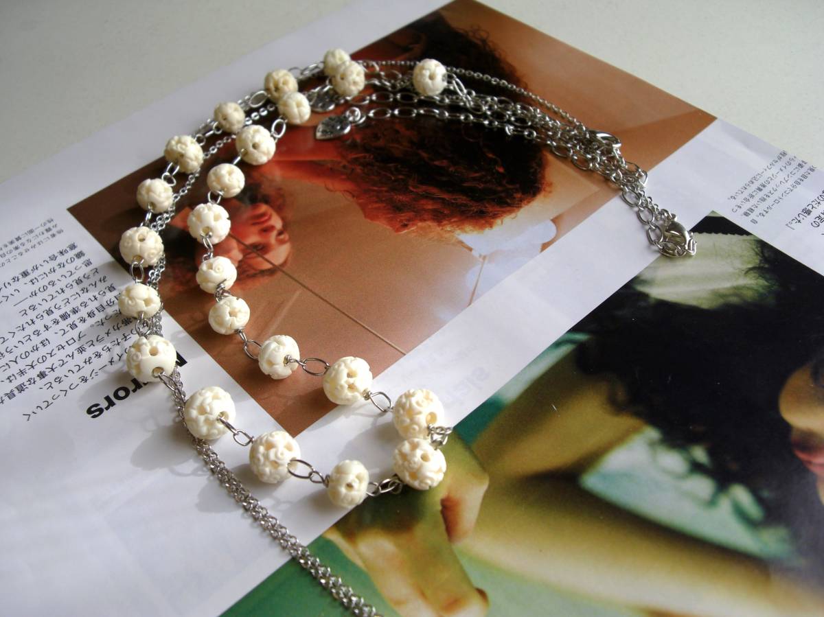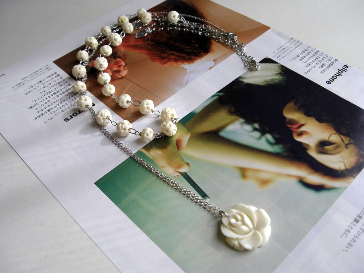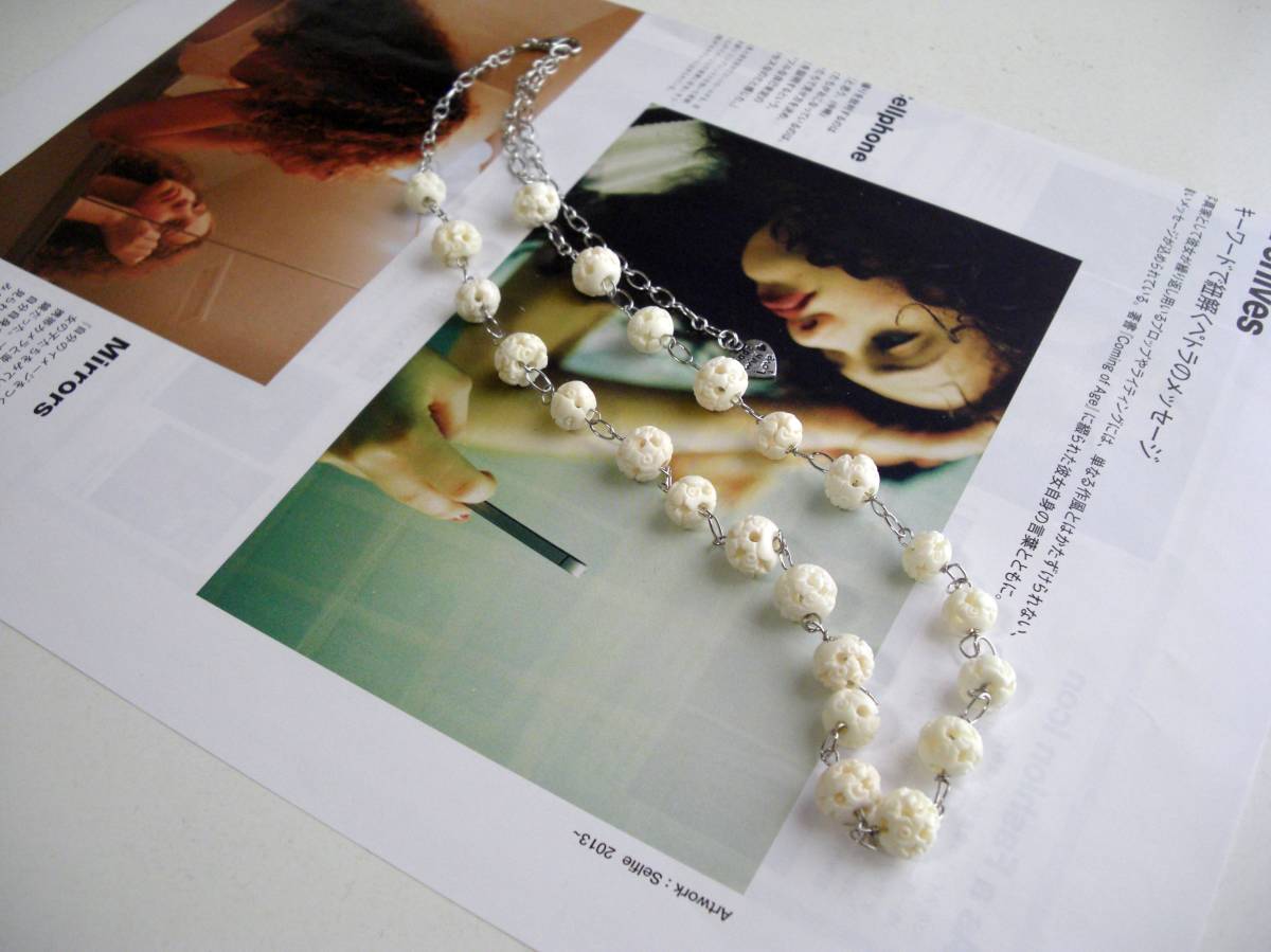 春色を繋いで・・シリーズです♪やさしい白のボーンと薔薇の一揃い・・ふんわりやさしいオフホワイトのボーンのネックレスのセットです♪ネックレスはデザイン違いの 2本です♪やさしい白がロマンチックな表情です♪9ミリ位の穴あきボーンのネックレスは合わせやすいデザインで す♪長さは全長66センチ位で調節自由です♪25ミリ位のボーンの彫り薔薇は華奢なチェーンを合わせました♪長さは76センチ+アジャス ター12センチで最長88センチ位です♪それぞれ単品でも出品しています♪シン プルで飽きのこないいつまでも着けられるデザインを考えて作りました♪ハンドメイドをご理解頂いてノークレーム、 ノーリターンでお願いします