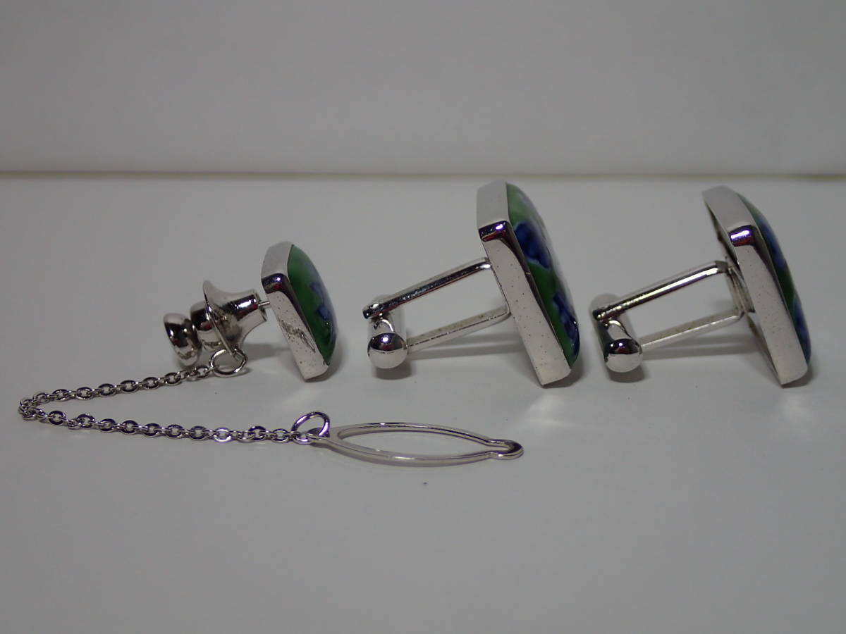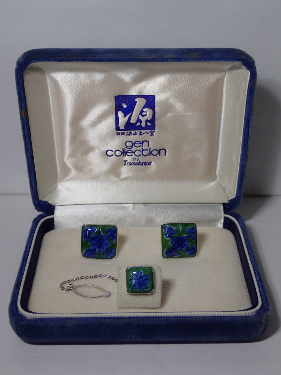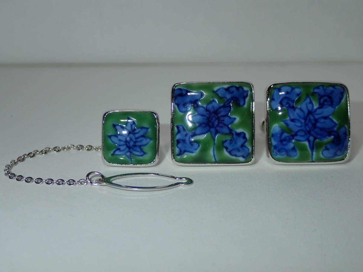 源右衛門窯 源コレクション gen collection by Tsunekawa タイタック カフス 箱あり 花 ブルー×グリーン×シルバー カフスボタン 銀