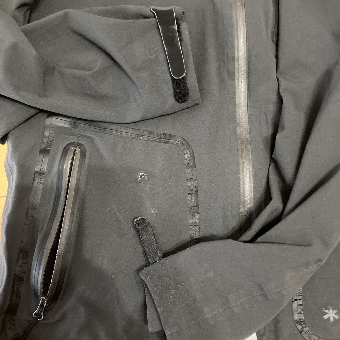 写真5枚目にあります通り、着用した際の右側ポケットに小さな穴が空いていて、左手袖の粘着テープ部分が取れかけております。