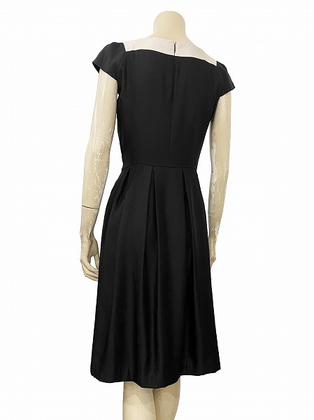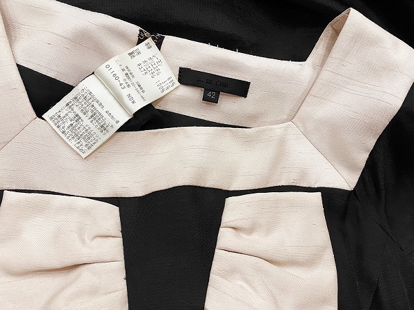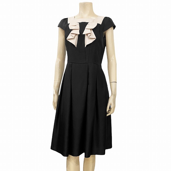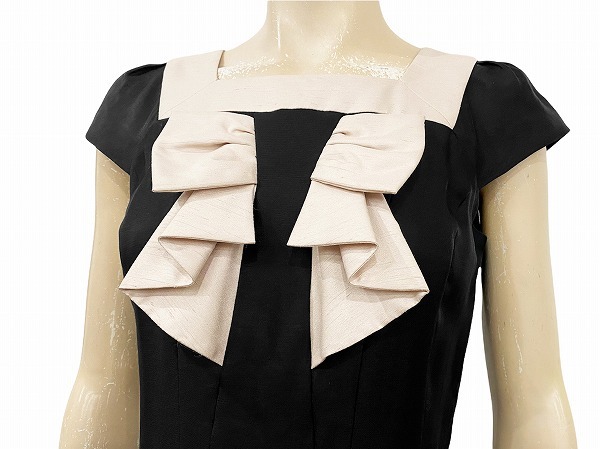 NM極美品☆トゥービーシック*TO BE CHIC★黒*ベージュ系★スクエアネック★リボン*上品なフレアワンピース★42号(9号*Mサイズ位/フォーマル