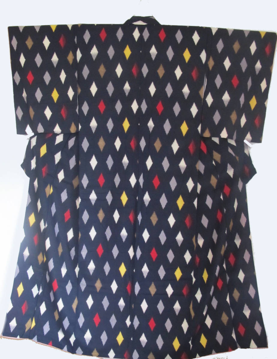 黒地にダイヤ柄のモダンなアンティーク着物です。 八掛はピンクです。 |