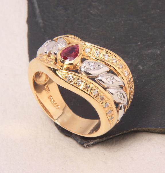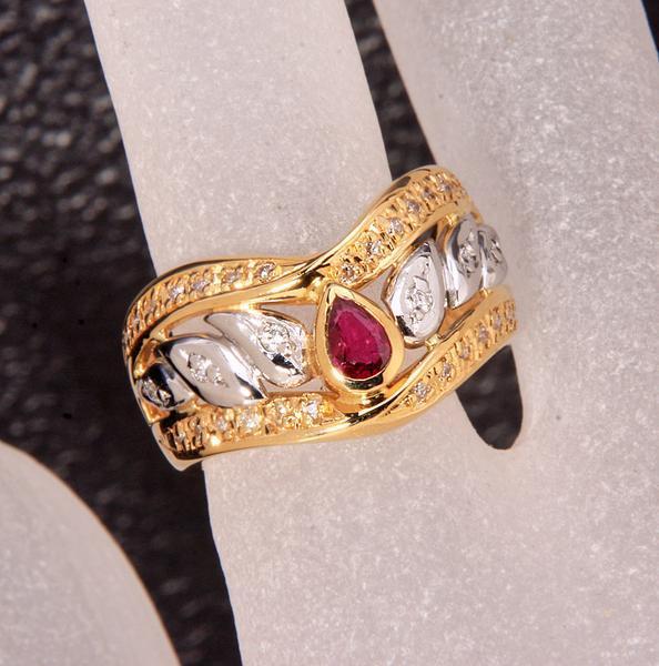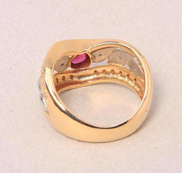 緩やかなV字の形にルビーとダイアが輝くデザインリングです。