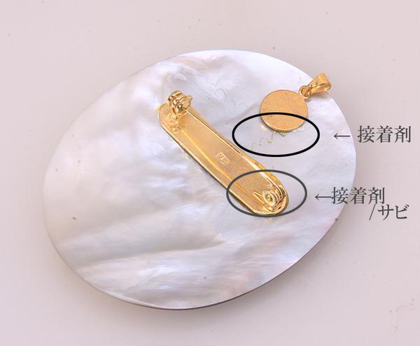 裏側には接着剤のはみ出しとブローチのピン部分にサビが見られます。