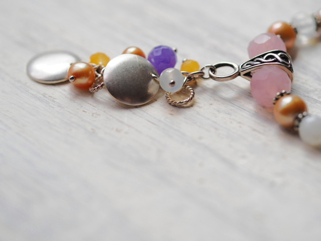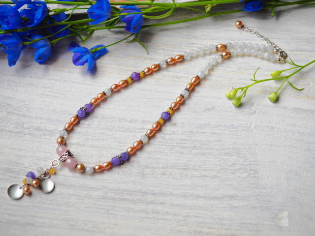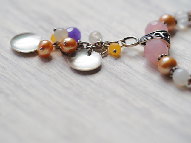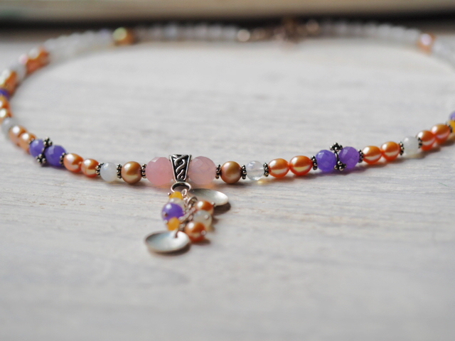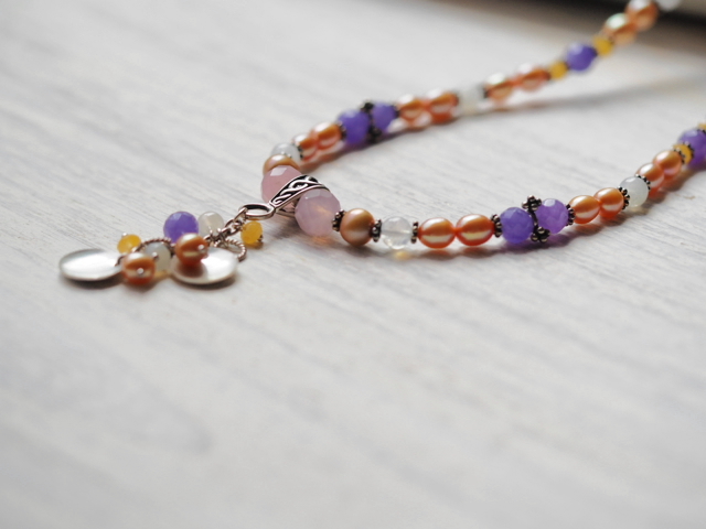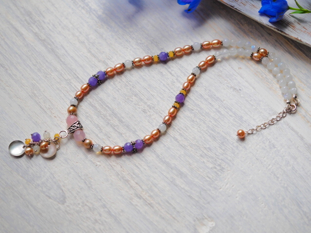 こちらは、アメジスト・イエロー水晶・ピンク水晶・ムーンストーン・淡水真珠の5種類の石を組み合わせたネックレス。