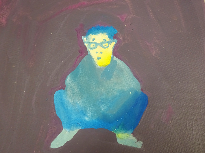 丸山直文のドローイング作品をご紹介いたします。深みのある色彩で、しゃがみこむ人物が描かれています。シート上部には制作当時紙を固定するために空けられたと思われる点状の穴が1箇所見られます。現在活躍する作家による貴重な一点ものの作品です。掲載画像をご覧いただき、ご不明な点がありましたらご質問ください。色味は1枚目の画像を参考にしてください。