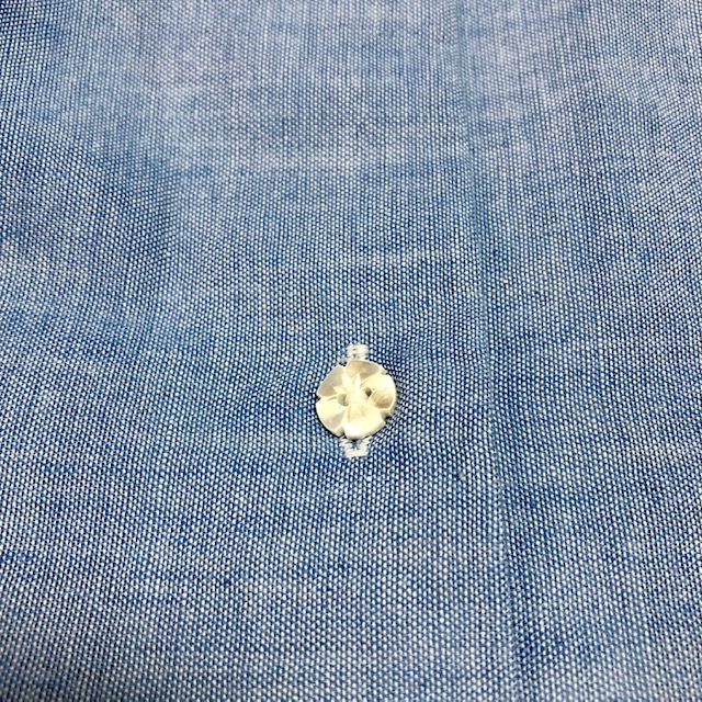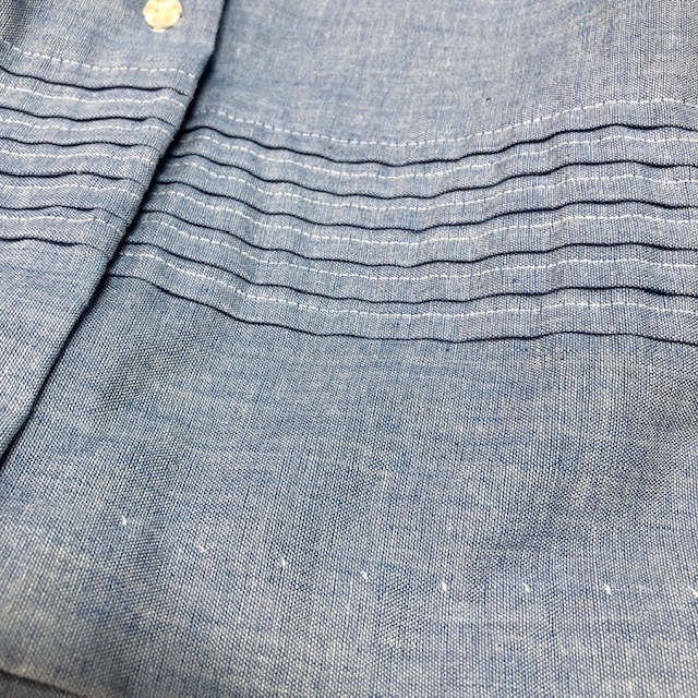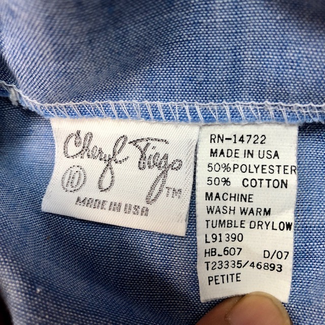 ●商品説明・・・アメリカ買い付け品になります。70年代頃~のヴィンテージのシャンブレー生地のフレアロングスカートです。made in USAです。前開きで、裾付近に横方向にピンタック入りで、アクセントになっています。ボタンも花柄の削り出しボタンで、可愛いです。素材はコットン50%、ポリエステル50%です。