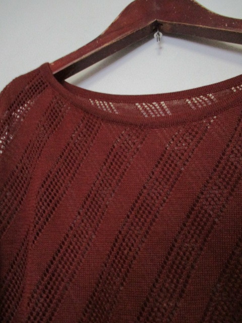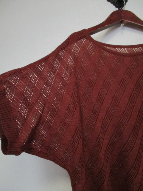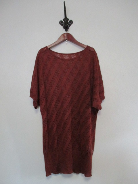 商品紹介 | 斜めに透かし編み模様が入った半袖ニットチュニックです。 赤みがかった茶色です。 《素材》 麻55% アクリル45% |
