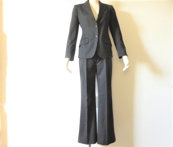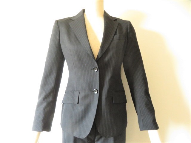 【ORIHICA】オリヒカ「RHYME ライム」の高級パンツスーツ お色は濃紺、ストライプ柄です。