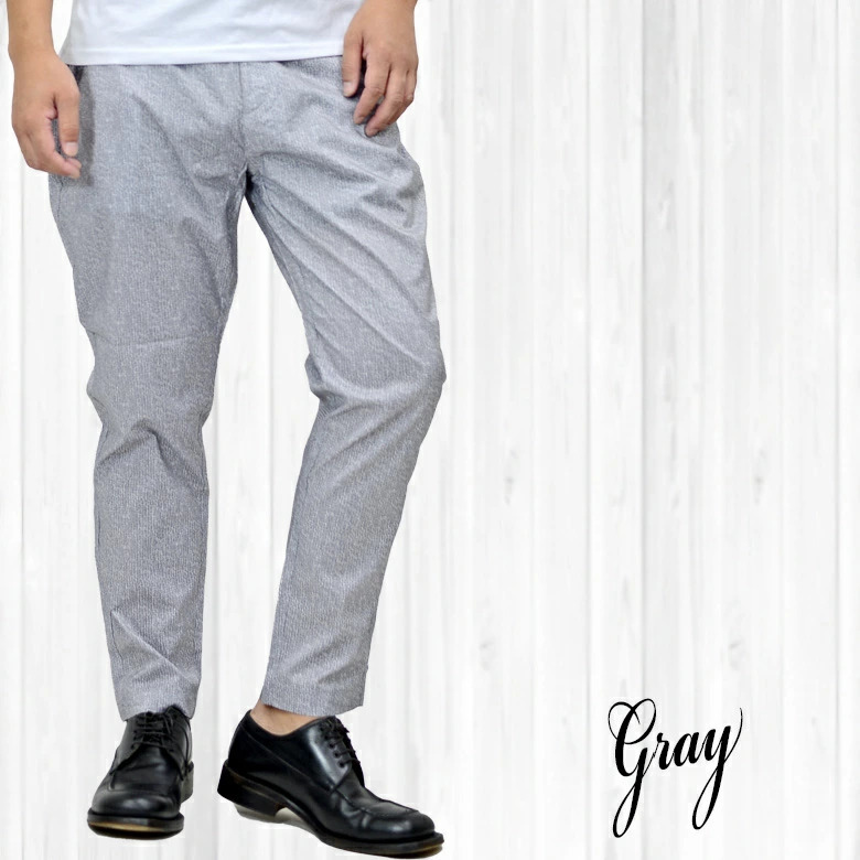 裾に向かってテーパードするスリムなシルエットが品のいいデザインで、スラックスとしても活用できます。