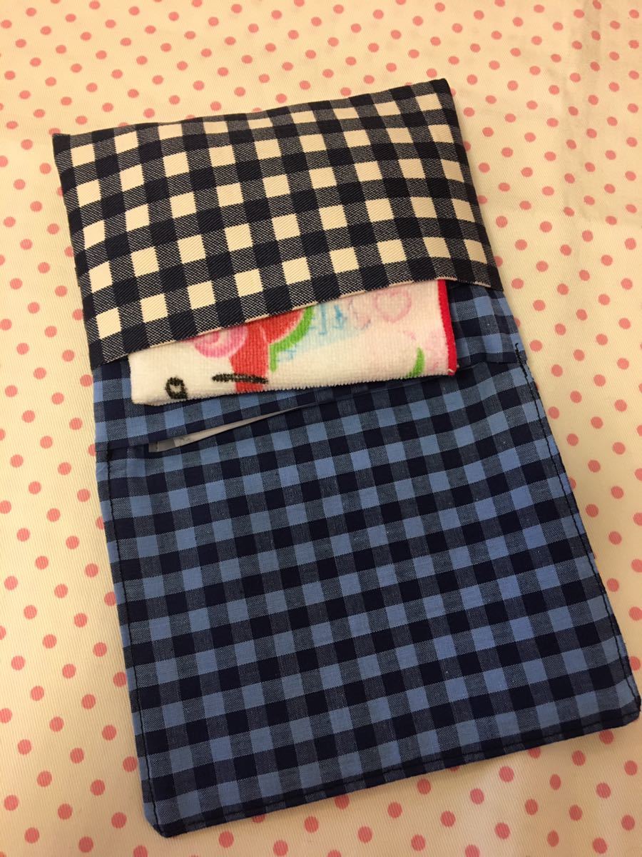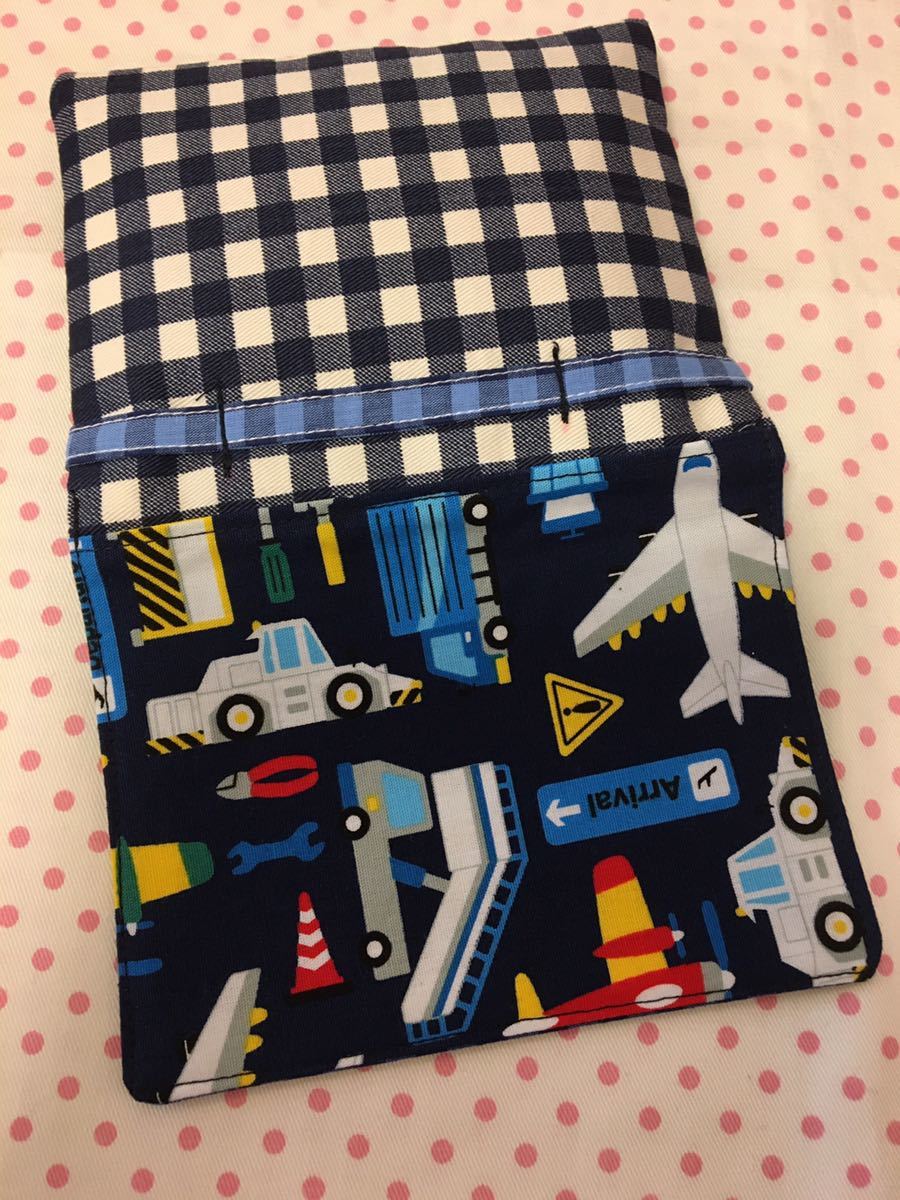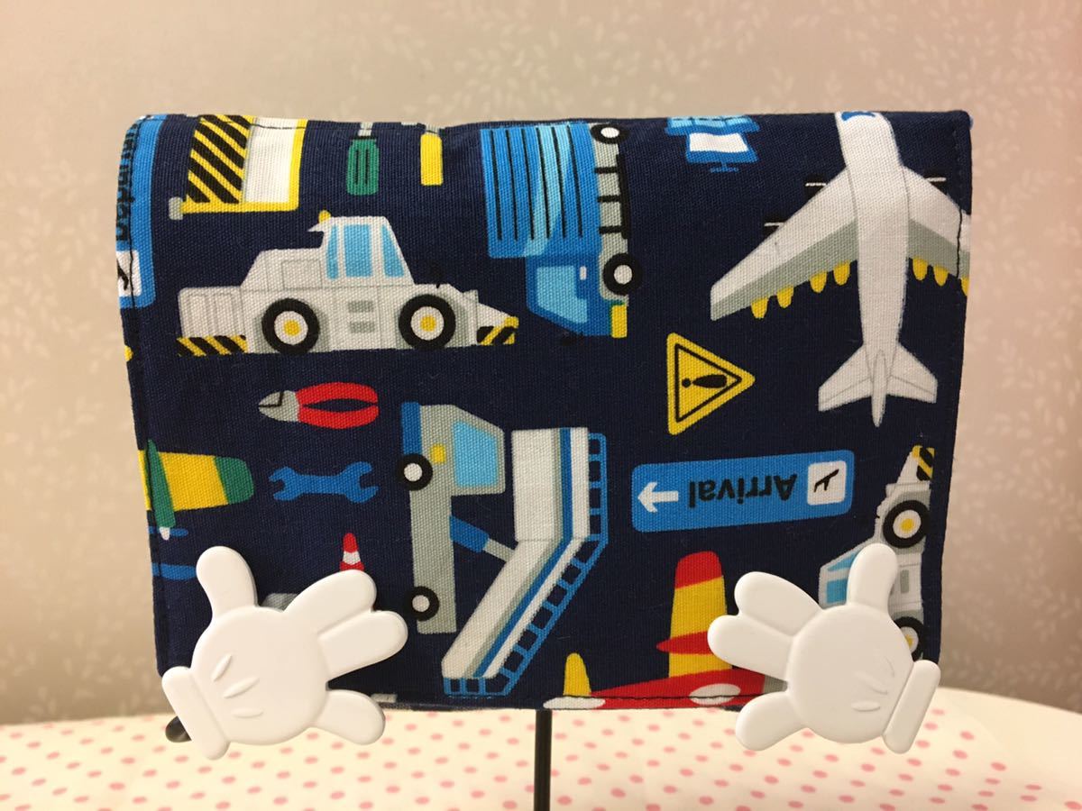 紺色に飛行機*空港柄の綿生地で移動ポケットを作りました。