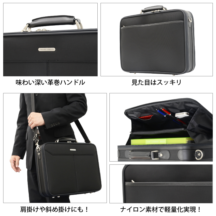 | 商品説明 | ☆A4ファイル(32.3×24.0)サイズ対応 ★サブルーム付きの2室仕様 ☆ショルダーベルト付き ★収納物固定十字ベルト付 【 商品詳細 】 ●サイズ:横幅39×高さ28×厚み10(センチ) 内寸:38×27×6センチ ●素 材:ナイロン ●カラー:(01)クロ ●メインルーム内部:本体に収納物固定十字ベルト付 ファスナーポケット、2分割ネット付きファスナーポケット ●サブルーム内部:カード入れ、ペン差し、小物ポケット ファスナーポケット付き中仕切り ●重 量:約1,250g ●生産国:日本(豊岡製) 現在お試し大特価、送料無料、値引き中でお買い得となっています。 ※ 予告なく仕様変更する事がありますのでご了承下さい。 |