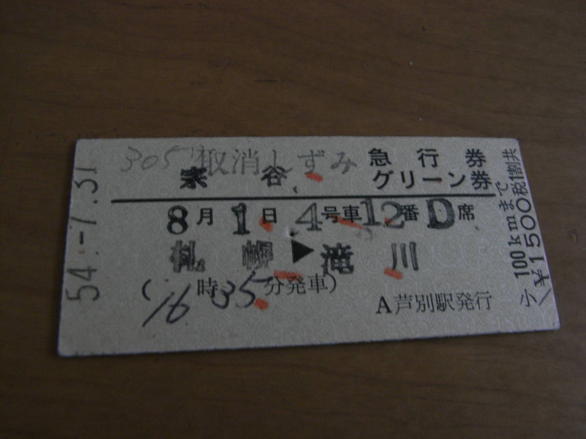 宗谷 急行券 グリーン券 札幌→滝川 昭和54年7月31日 芦別駅発行