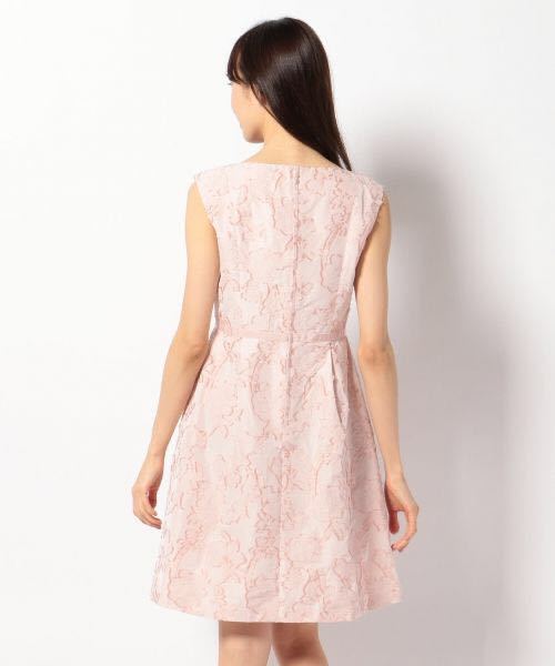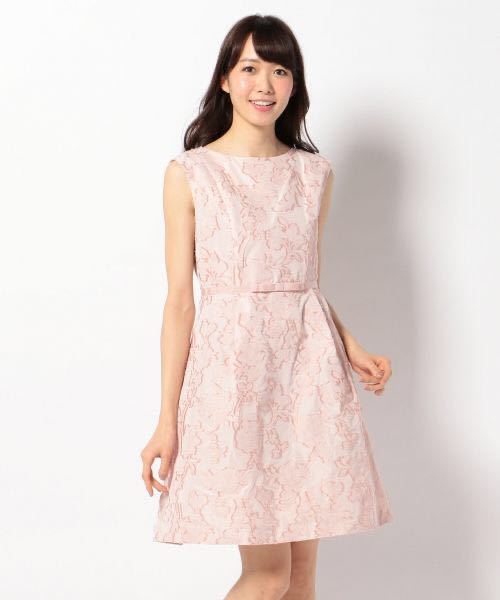 ~APPLAUDIR LINE~細番手のポリエステルを高密度に織り込んだ、非常に手の込んだメモリータイプのカットジャカードです。無地柄ですが表面の凹凸感と程良い光沢が高級感のある素材です。ボートネックと上身頃からスカートにいたるまで、女性らしいフィット&フレアシルエットのドレスです。スカートのタックがポイントで、ふんわりと適度なボリューム感に仕上がっています。ウエストのグログランで作ったリボンがよりエレガントさを引き立てます。コンパクトな丈感のニットカーディガンと相性◎です。