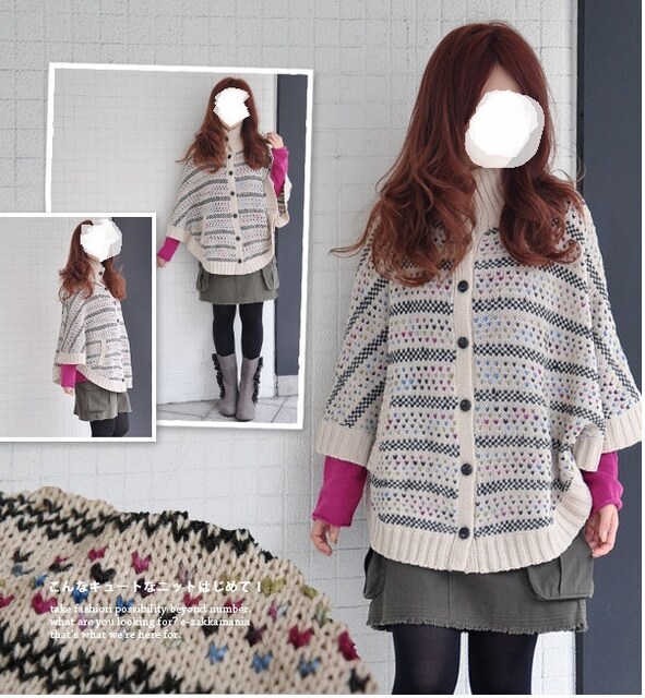 ※カラフル糸のゆるみが生じやすいポンチョです。 特に最初から深緑の糸の部分は、ゆるみのある部分が多々あります。