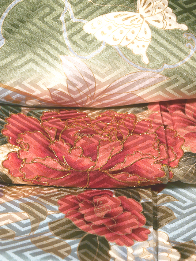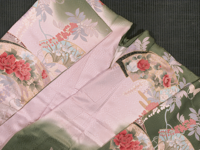 深く沈んだ千歳緑色の地に、紗綾形(さやがた)の地紋が織り出され、薄葡萄(うすぶどう)色のぼかし、藤や蝶などの配された垣、菊や牡丹、杜若(かきつばた)などの草花の配された扇などの文様が染められている、綸子の振袖です。袷仕立てです。 現代的なお色目で、落ち着いた豪奢と華やかさが感じられます。さまざまな文様が配されていて、見飽きない伝統美と一目でわかる格調の高さが感じられます。 ユーズド品と思われますが、使用感は感じられません。しみやよごれ、褪色などのダメージも見あたらず、ほぼ新品同様にきれいな状態です。 |