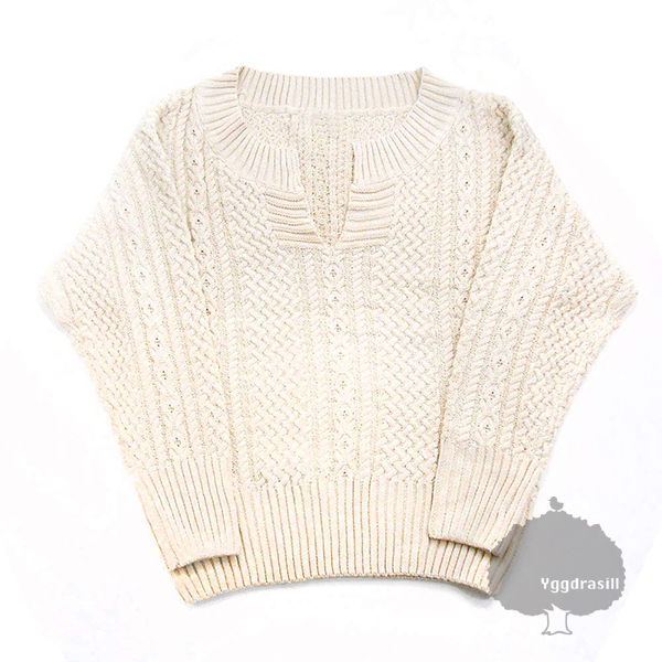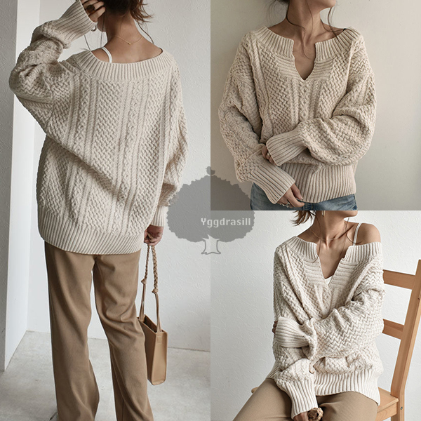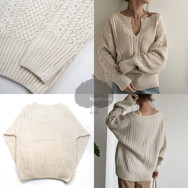 商品名:YGG★新品 キーネック ケーブル編み ニット 長袖 アイボリー レディース フリーサイズ 白系 ホワイト トップス オールシーズン