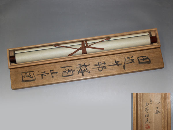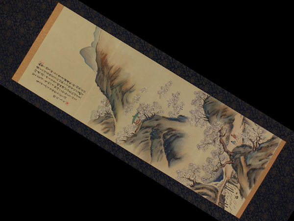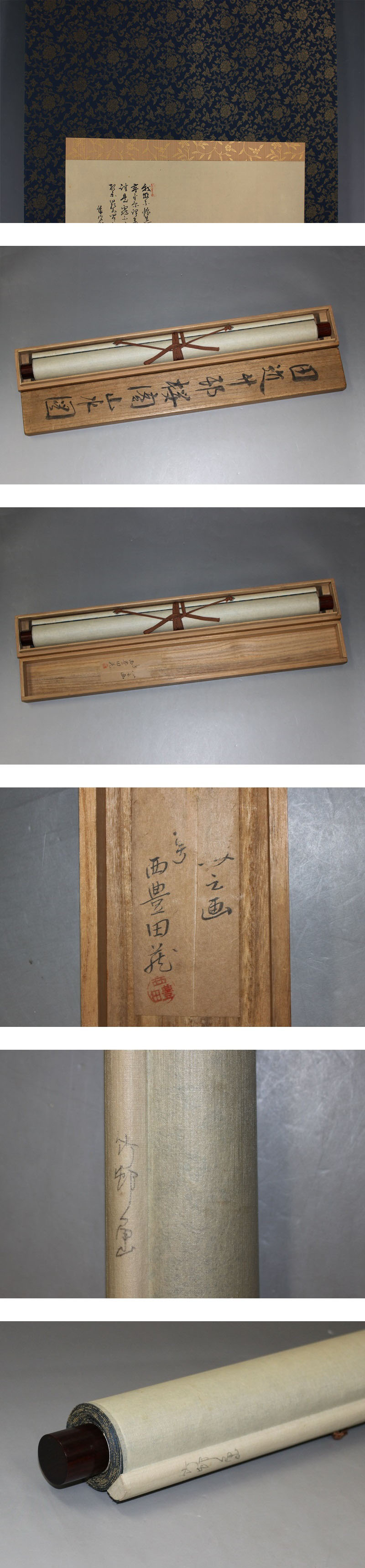 田近竹邨 たぢか-ちくそん (1864-1922) 明治-大正時代の日本画家。 元治元年4月28日生まれ。田近陽一郎の子。郷里で淵野桂僊に,京都で田能村(たのむら)直入にまなぶ。明治29年日本南画協会に参加。41年第2回文展から大正3年第8回まで連続受賞。10年日本南画院を結成。大正11年4月11日死去。59歳。豊後(大分県)出身。京都府画学校卒。本名は岩彦。 本紙は、点染みがあります。 表装は、概ね良好です。 【サイズ】 作品 横約42.5cm×縦約122cm 表装 横約55.5cm×縦約191cm |