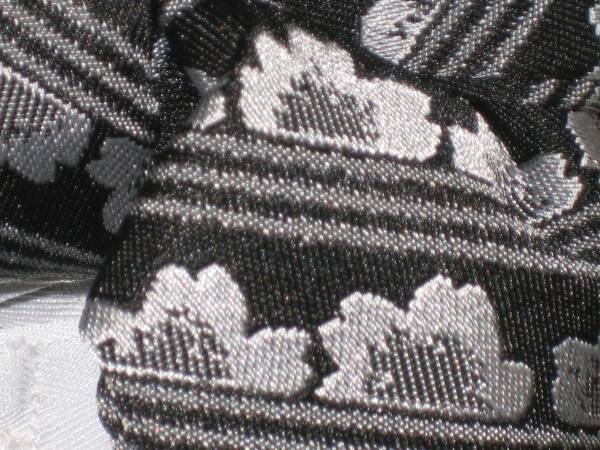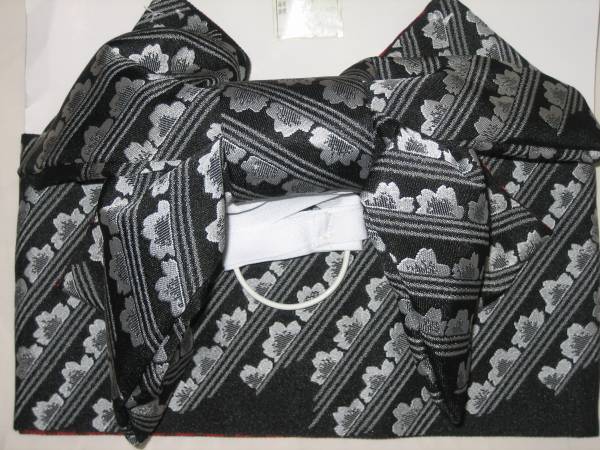 女性yukata用、地紋柄結び帯  くろ  ポリエステル  新品(織り地紋柄ありです。波状の写りはレンズの光学的ないたずらで現品にはありません、また薄く濃く写っている場合もあります)、胴部--帯巾約16,5cmx長さ約130cm、リボン部は横に約30cm。見た範囲で汚れないと思いますが、着用に差し支えない薄汚れ(多分ない?)はあってものお値段で出品です。