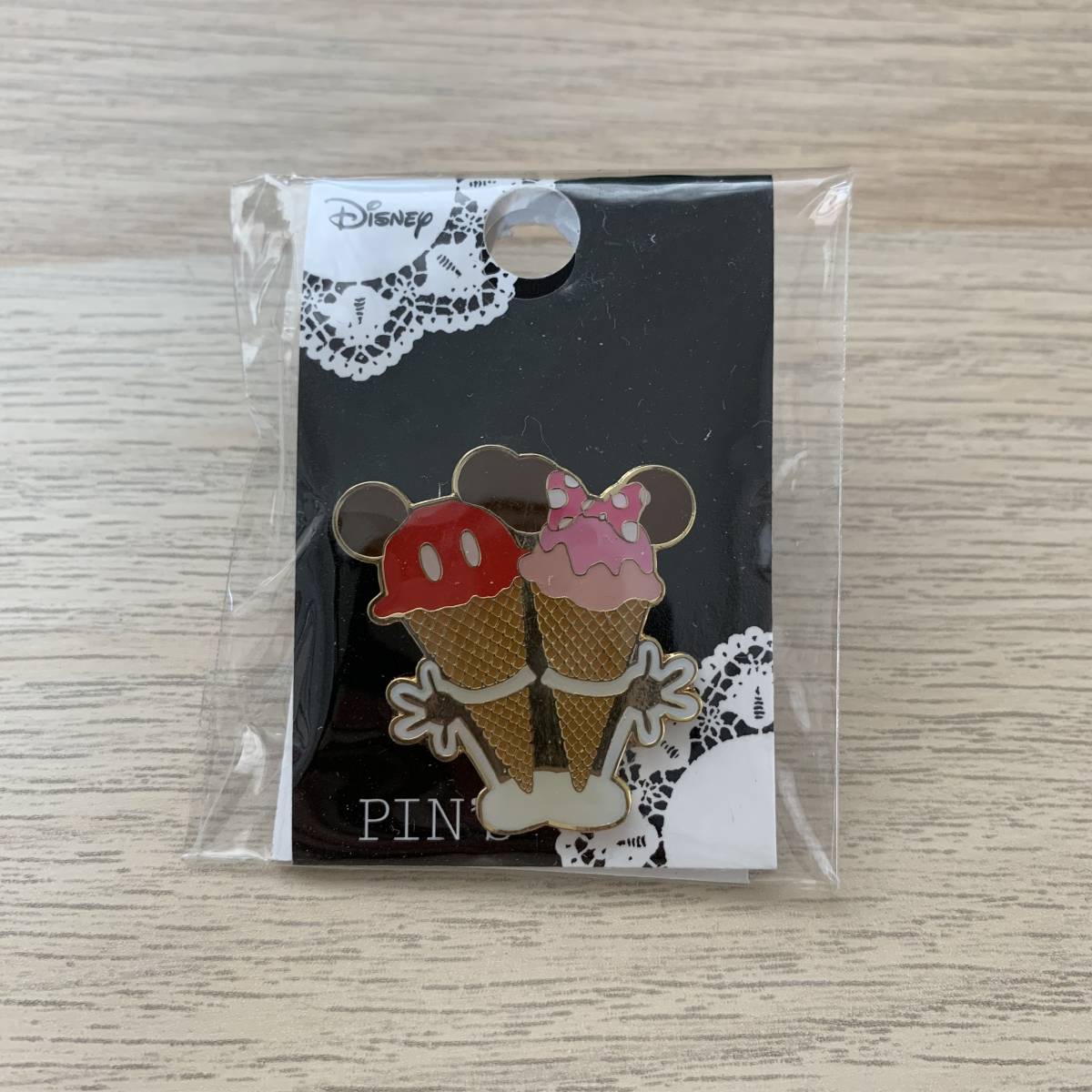 ミッキーとミニーがアイスクリームに変身したようなデザインのかわいいピンバッジです。