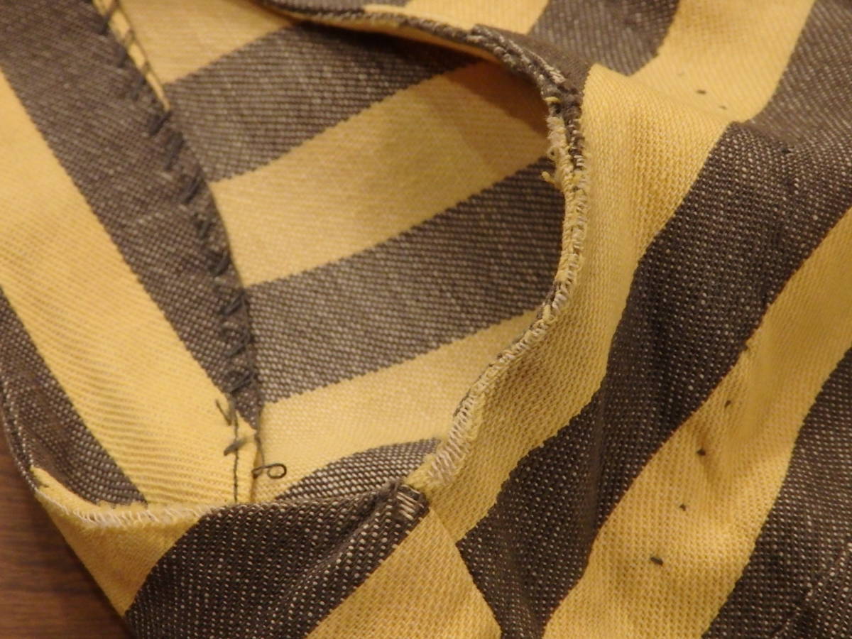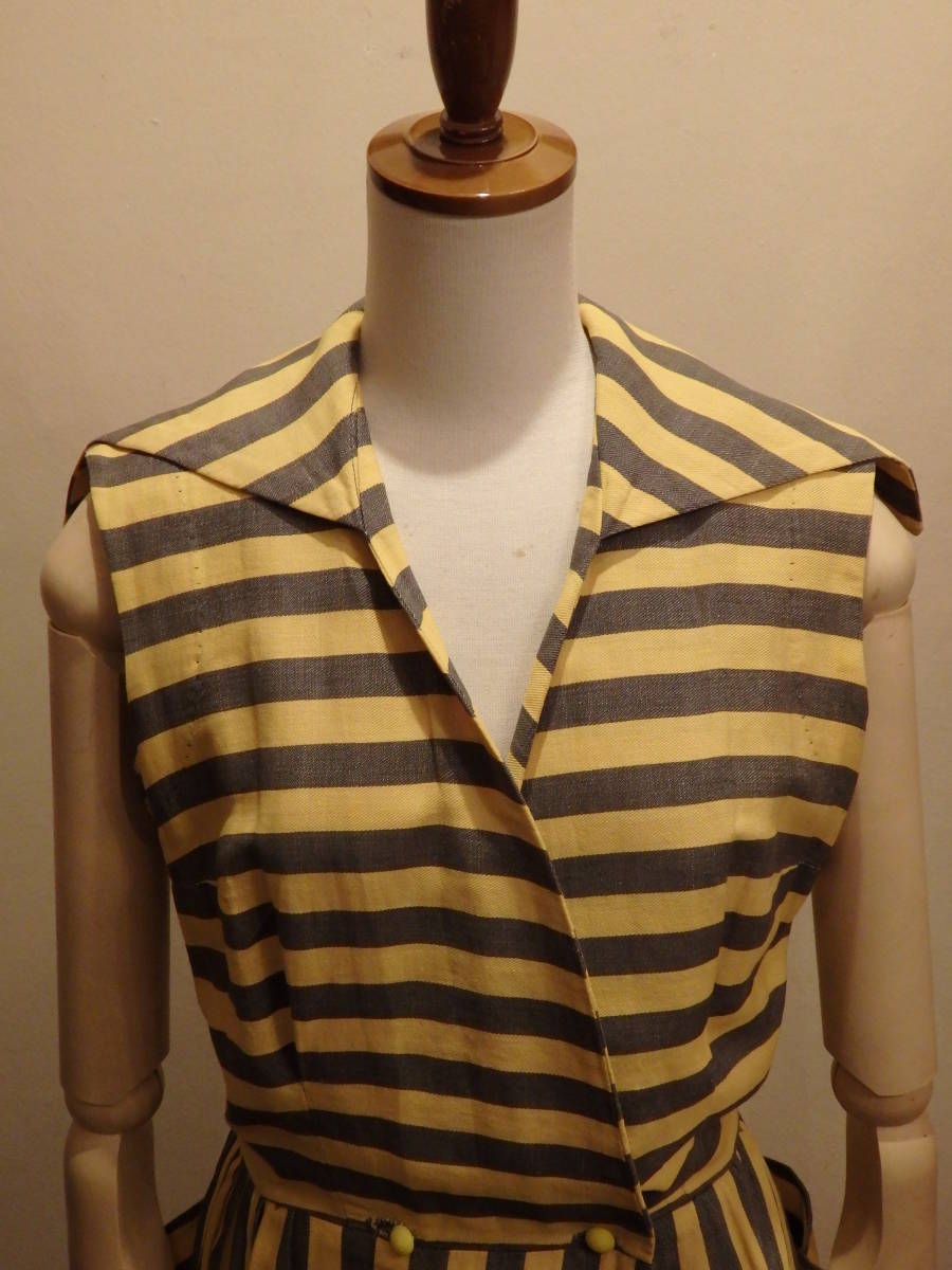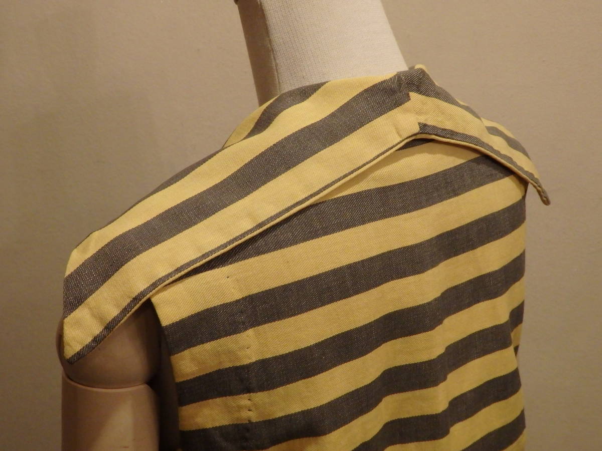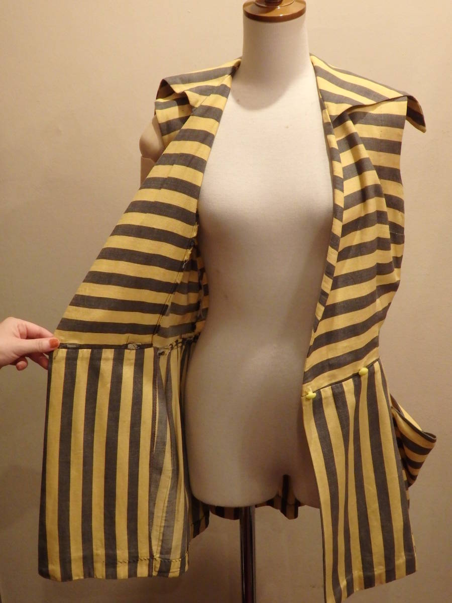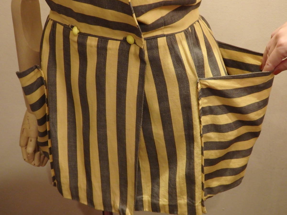 何といっても、この時代を代表する柄:ストライプの生地方向を巧みに切り替え、躍動感ある印象に仕立てています