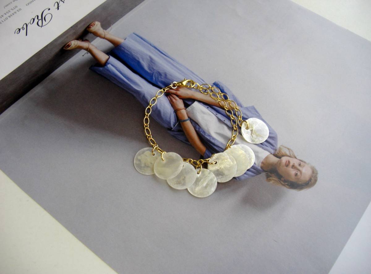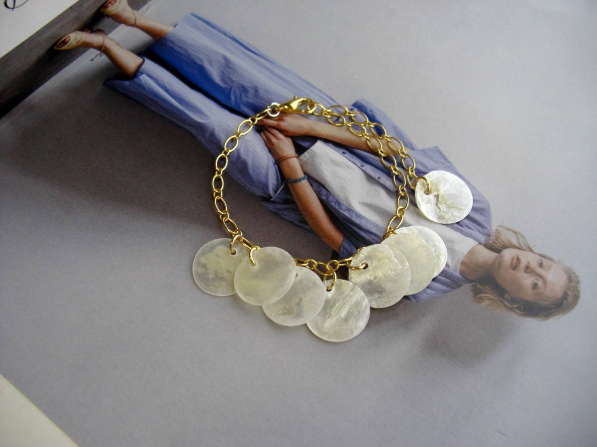夏色・見本帖・・シェルの魔法・ナチュラルな色合いが素敵なシェルのブレスレットです♪薄いラウンドシェルが大人のロマン チックしています♪15ミリ位のラウンドシェルはデザインチェーンに繋いでキュートな表情です♪長さは全長23センチ位で調節自由です♪お揃いのシリーズも 出品しています♪シンプルで長く着けていただけるデザインを考えて作りました♪ ハンドメイドをご理解頂いてノークレーム、ノーリターンでお願いします