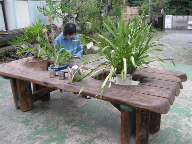私が精魂こめて自作した丸太テーブルです。