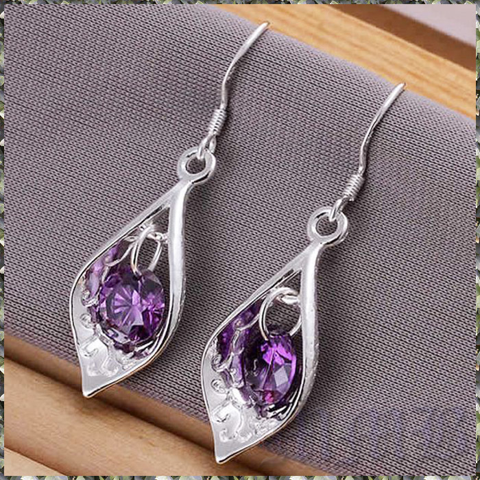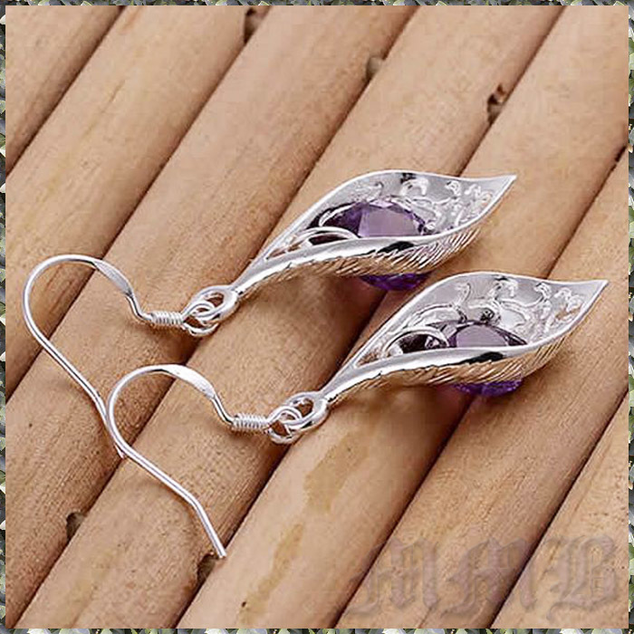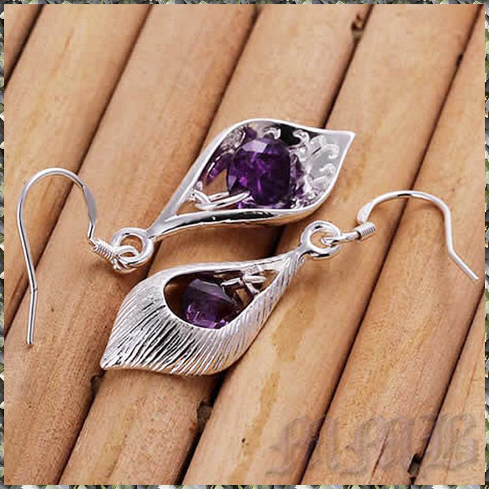 925 Sterling Silver Plated φ8mm パープル アイ ボール CRYSTAL CZ リーフ ドロップ フック ピアス です。