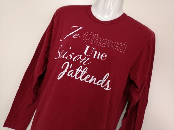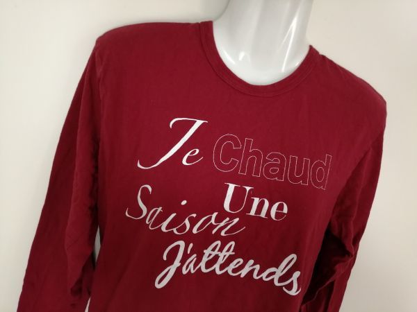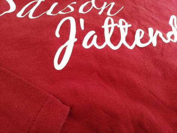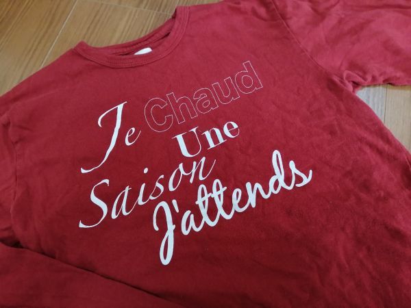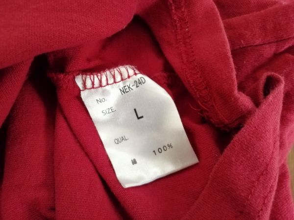 少し暗めの赤のコットンカットソー生地のプリントTシャツです。