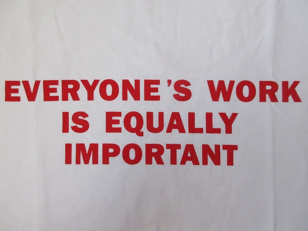 1950年に、アメリカ・オハイオ州・ガリポリスに生まれ、「Ohio University(オハイオ大学)」で版画・絵画を学んだのち、美術大学「Rhode Island School of Design(ロードアイランド・スクール・オブ・デザイン)」で学び、「言葉」を取り込んだ作品を作り始めたことからキャリアをスタートさせた、「電光掲示板」、「ポスター」、「公衆電話」の広告等のメディアを作品の発表手段として積極的に活用した「WORD ART(ワード・アート)」スタイルで知られ、日本国内では「藤原ヒロシ(HF/Hiroshi Fujiwara)」氏がかつて着用していた「THE FUTURE IS STUPID(ザ・フューチャー・イズ・ステューピッド)」のパッチ(ワッペン)が施されたカモフラージュ柄(迷彩柄)のキャップでも知られる現代美術家、〔Jenny Holzer(ジェニー・ホルツァー)〕さんが、2018年7月23日~2019年7月31日に、イギリス・ロンドンのテムズ川畔、サウス・バンク地区にある国立の近現代美術館、〔Tate Modern(テート(テイト)・モダン)〕で行った、「ARTIST ROOMS : Jenny Holzer Exhibition at Tate Modern」の開催を記念してリリースされた、Tシャツ表面に、シンプルながらインパクトのある、〔Jenny Holzer(ジェニー・ホルツァー)〕さんが1978~1983年頃に手掛けた作品として知られる「EVERYONE'S WORK IS EQUALLY IMPORTANT」のプリントが施された、〔ARTIST ROOMS(アーティスト・ルーム)・EVERYONE'S WORK IS EQUALLY IMPORTANT・Tシャツ〕になります。