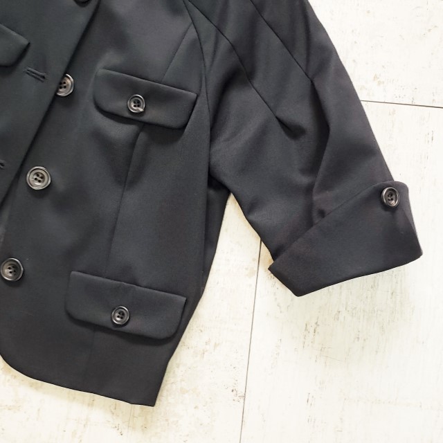 商品説明 | ・ ラグランデザインの ノーカラージャケットです。 5分袖程度の袖丈で、フォーマルシーンにも使いやすいデザインです。 ショート丈で、ノースリーブワンピースの上着としてもオススメです。 ・素材 ウール100% 裏地:キュプラ100% ・カラー ブラック(画像参照) ・製造国 日本製 ・付属品 無し ・サイズ 4 ※ Lサイズ程度 着丈 約44.0cm(襟の付け根から裾までの寸法) 身幅 約42.5cm(胸囲・脇下間の寸法) 裄丈 約41.0cm 袖下丈 約15.0cm ・商品コンディション 着用感が少ない良いコンディションです。(画像参照) 個人保管商品ですので、店舗コンディションをお求めの方はご入札をお控えください。ご理解の上ご入札お願いいたします。 |