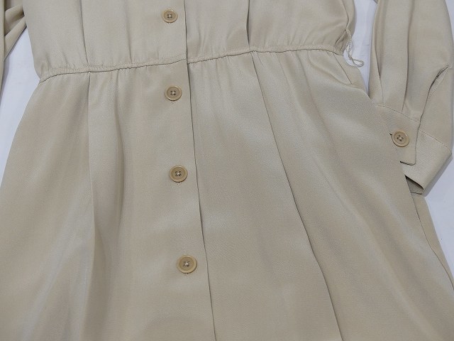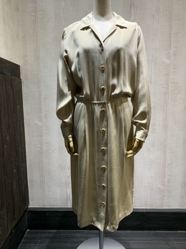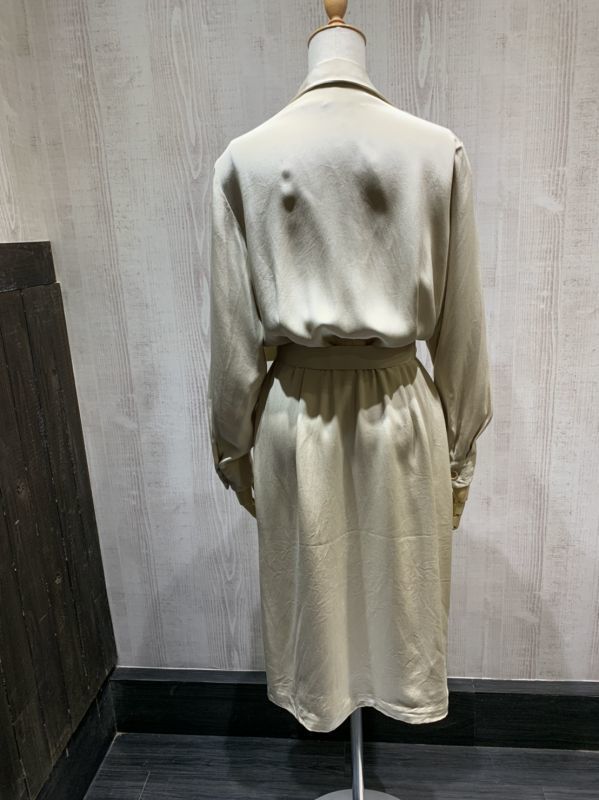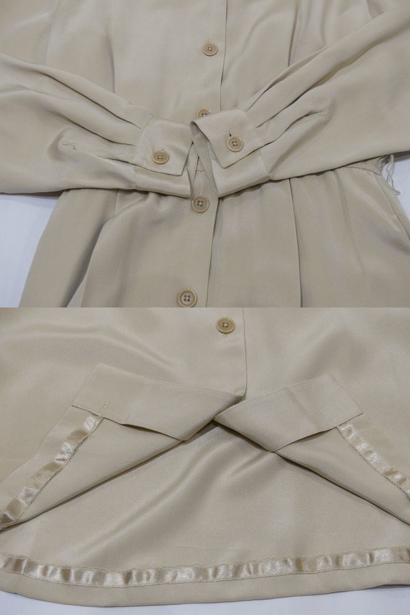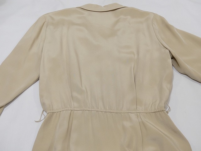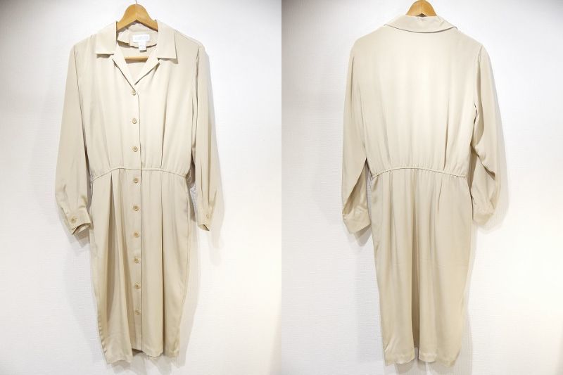 | こちらは、90年代頃のLAND'S END シルク ワンピース ドレスです。 オープンカラーや光沢のあるベージュカラーは大人っぽい印象で、ウエストがゴムのデザインは着心地も良くシルエットも綺麗です。付属のベルト付きですが、ベルトループもありますので、お好きなベルトでウエストマーク出来ます。シャツワンピースの様なシンプルデザインで、シルク素材は高級感もあり、飽きが来なく長くご愛用頂けそうです。 コンディションは使用感も少なく綺麗な状態です。 素材 シルク サイズ 10(着用感M-L位) 肩幅41cm 身幅106cm 袖丈58.5cm ウエスト約68-86cm(ゴムになっています)着丈112cm 撮影用BODYサイズ 肩幅37cm バスト82cm ウエスト60cm ヒップ86cm 素人採寸の為、多少の誤差はご了承ください。 | |||