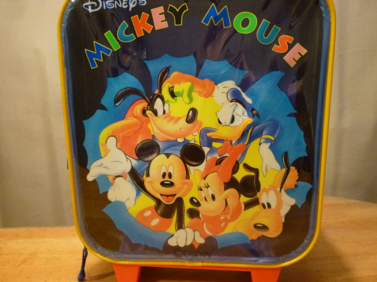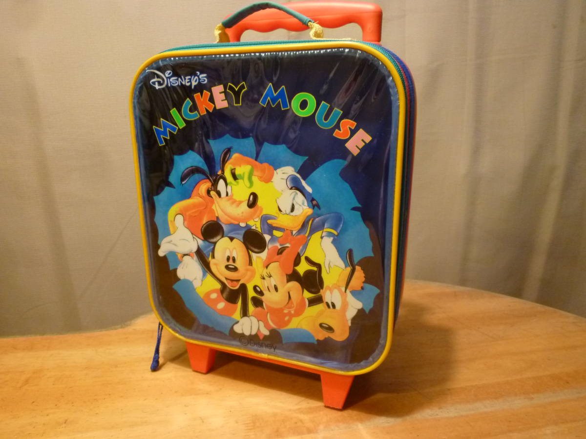 こちらは皆んなが大好きなディズニーで、そのキャリーバッグの様です。表面透明ビニール面にはミッキー達が一斉に飛び出した様なにぎやかなプリントが、ファスナーは左右から、引き上げ式のハンドルと別に持ち手も付いていて、沢山のお買い物にも楽にコロコロと重宝すると思います。