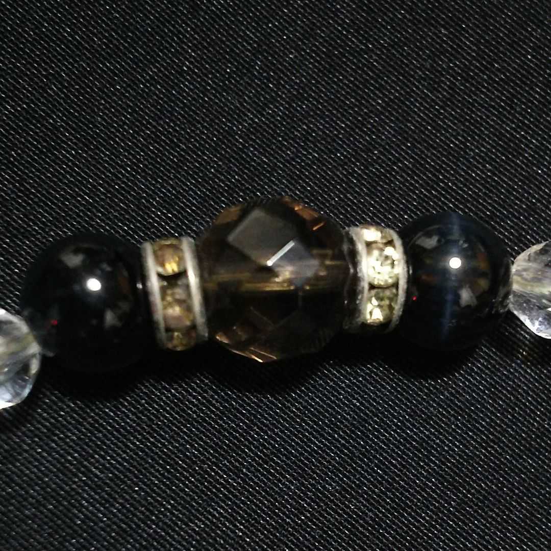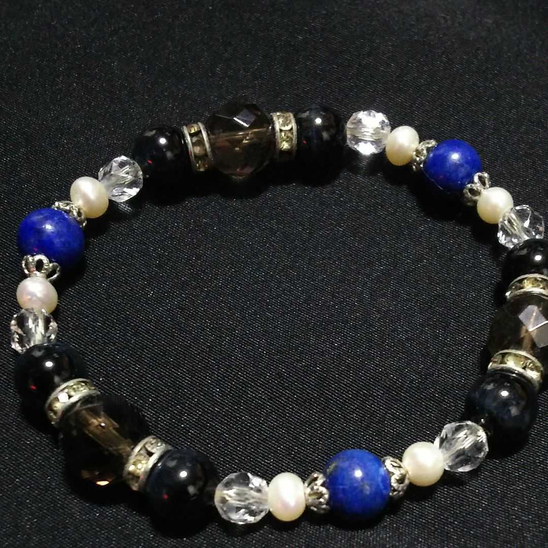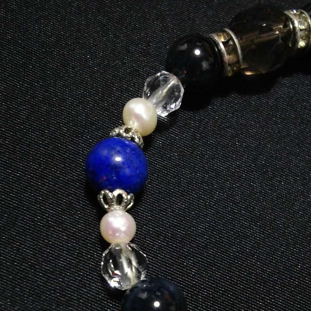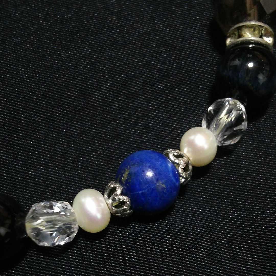 天然石とパールで作られたストーンブレスレットです。ラピスラズリ、スモーククリスタル、水晶、メノウなどの石が使われています。