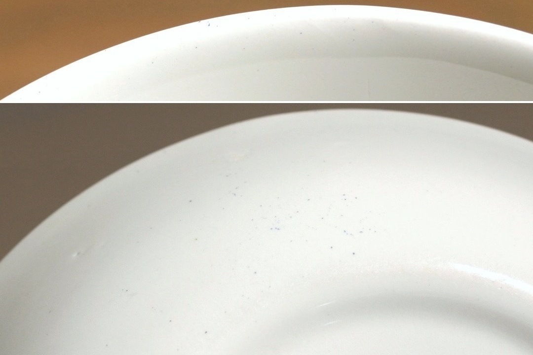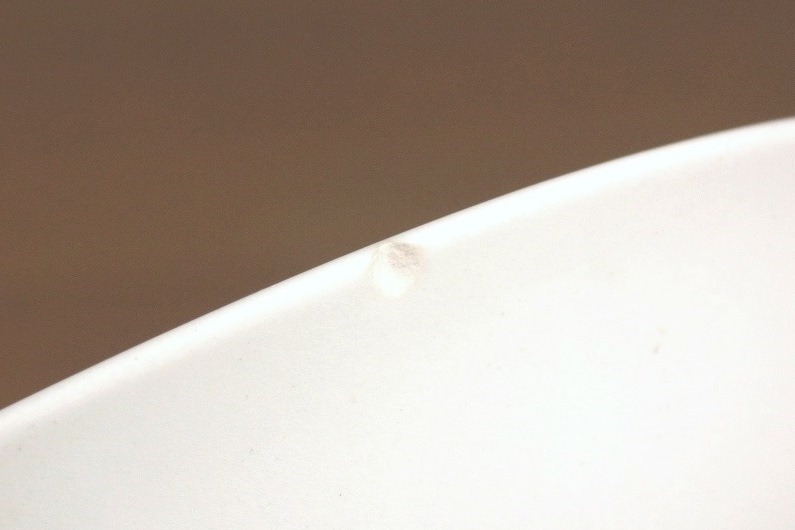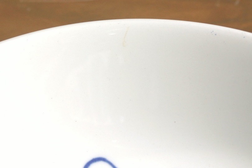 ボウル口縁裏側に欠けが有りますがひびや補修痕などは無く、ヴィンテージとしては良い コンディションです。(4・5枚目画像参照) 画像の白い部分や色の薄い部分は光の反射によるもので色抜けなどは有りません。 光に透かすと擦れ疵は見られますが目立つものは無く、全体に艶も有って使用感はあまり 感じられません。 表面上方に薄い線が見られます。(6枚目画像参照) 口縁から裏面にかけて細かな顔料付着が見られます。(7枚目画像参照) ボウル裏面数箇所に釉薬斑や焼成時の支柱痕が見られます。(8枚目画像参照) ヴィンテージ品には釉薬ロスやスポット、色斑、小さな窯疵や歪みなどが見られる場合も 有りますが、これらが製造された時代の製造技術、出荷基準では通常品扱いで販売された ものとして、ご理解をお願い致します。 経年や使用に伴う劣化、汚れ、疵などについては、出来るだけ詳細に説明をしていますが 細かな状態の全てを記載することは出来ません。 ヴィンテージ品についての受け止め方は個人によって其々異なりますので、ご不明な点が 御座いましたら、どうぞご遠慮なくお問い合わせ下さい。 |