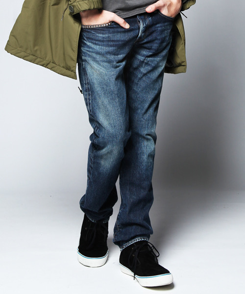 DEEP BLUE加工:13.5ozジンバブエセルビッチデニムを使用し、70'Sのヴィンテージデニムを再現しました。丁寧に着こんだような色落ちが特徴の濃色USED加工です。