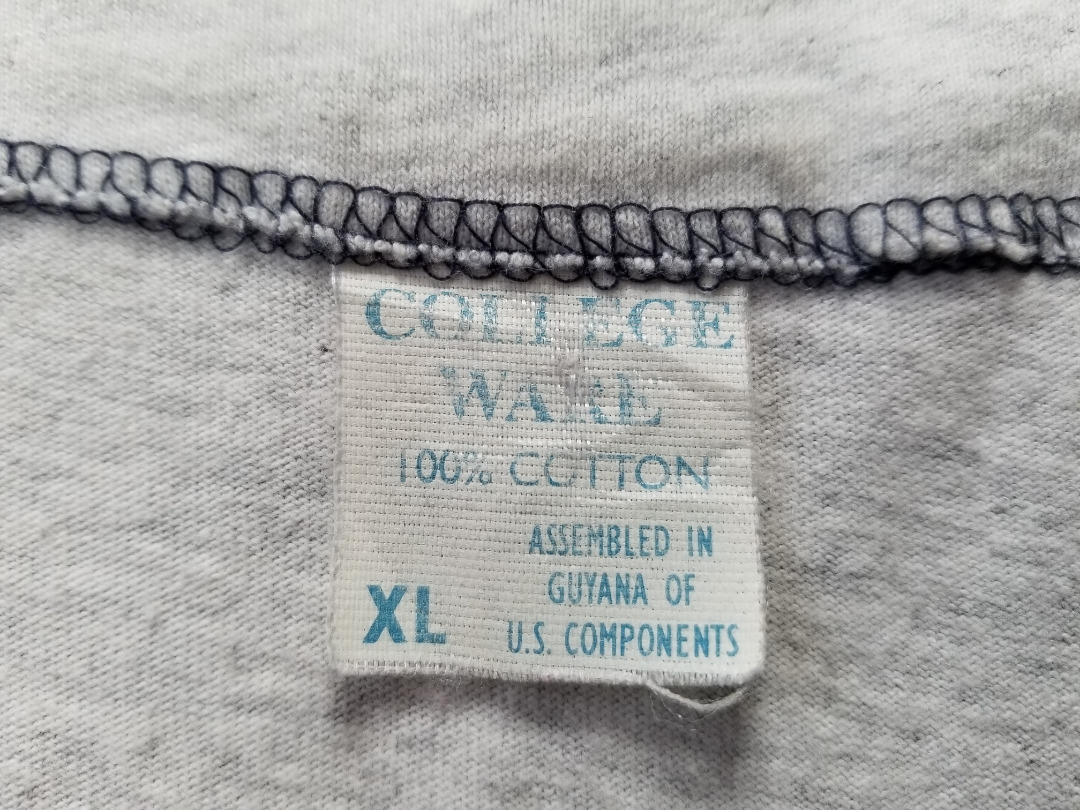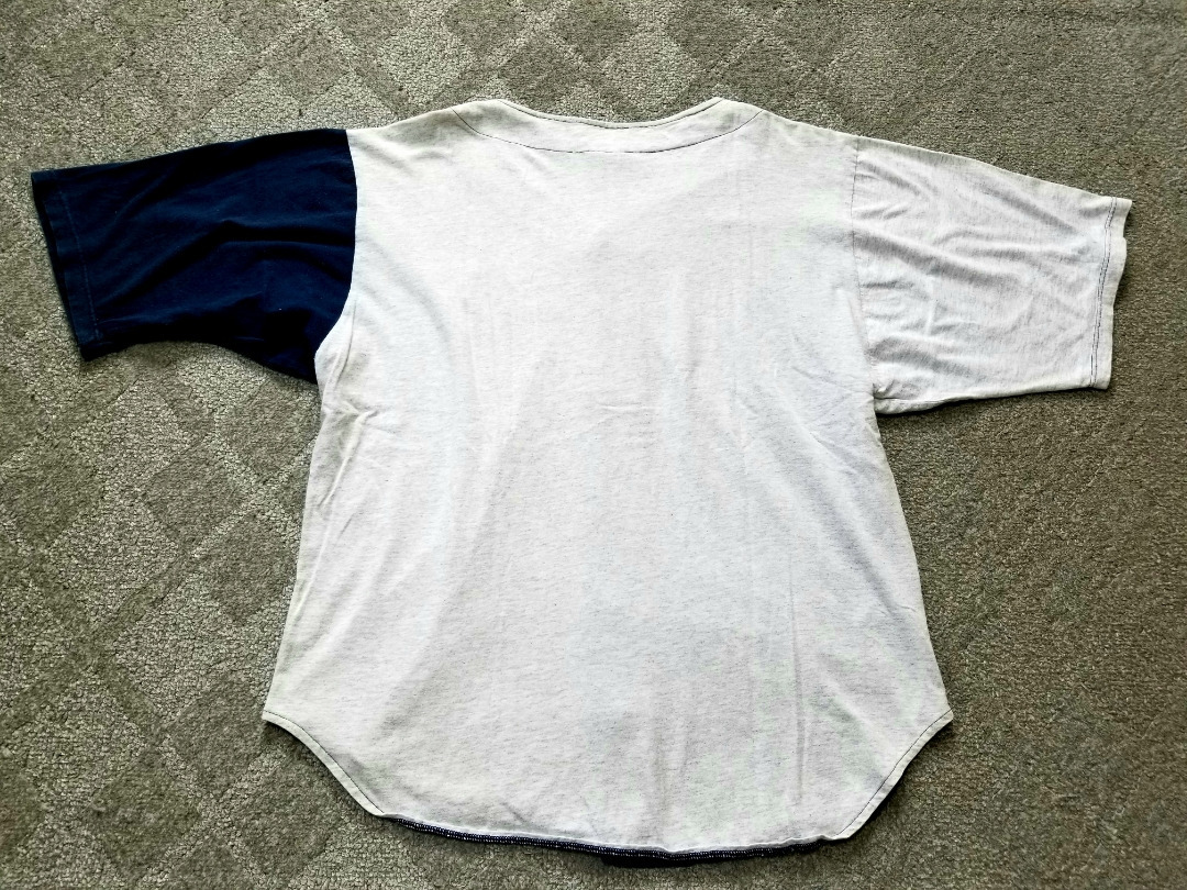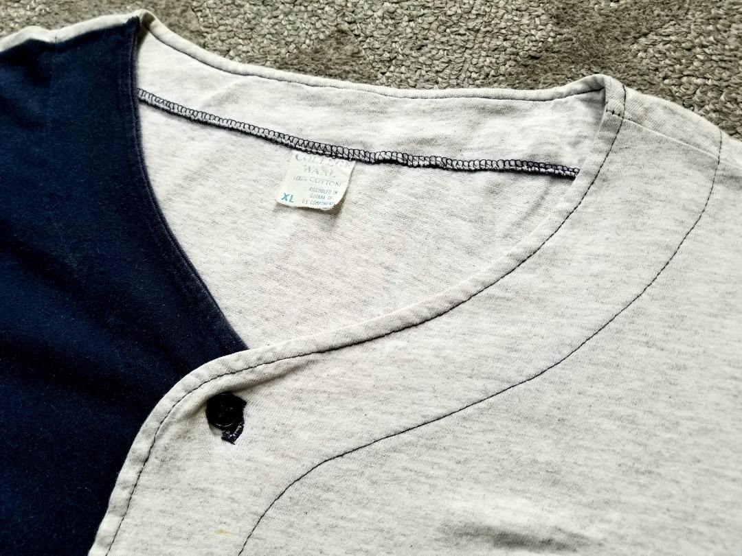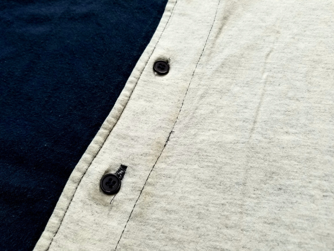 グレー×紺の綿100%の天竺を使用した一着で、サイズ表記はXLです。