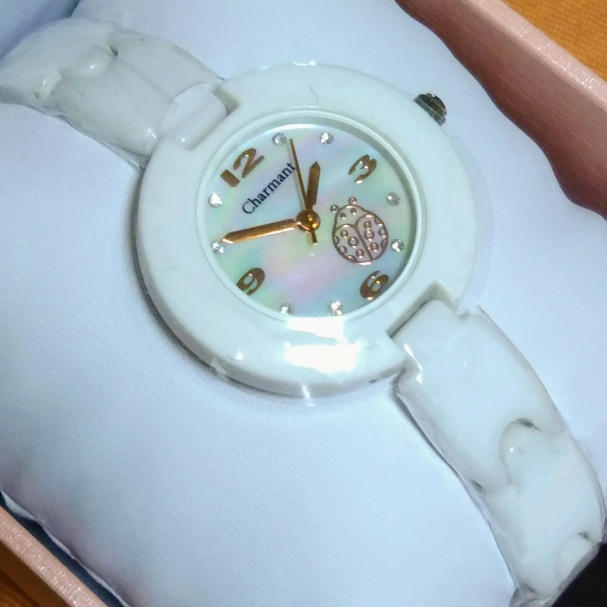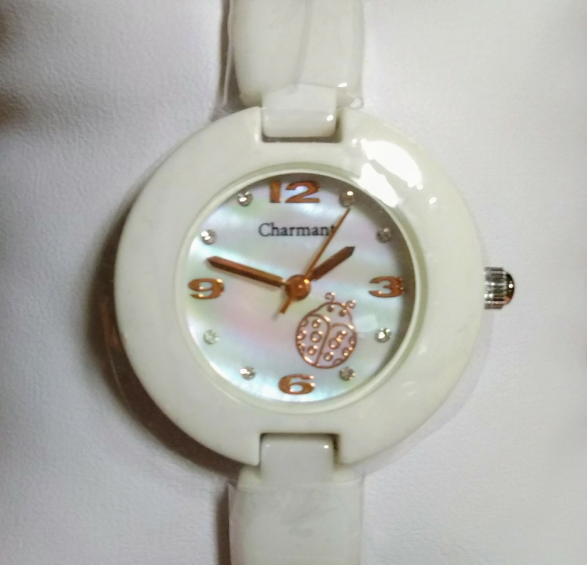幸運を呼ぶと言われているてんとう虫をモチーフにしたレディースウォッチ。シンプルなフォルムにてんとう虫がちょこんと乗った可愛らしいデザイン♪