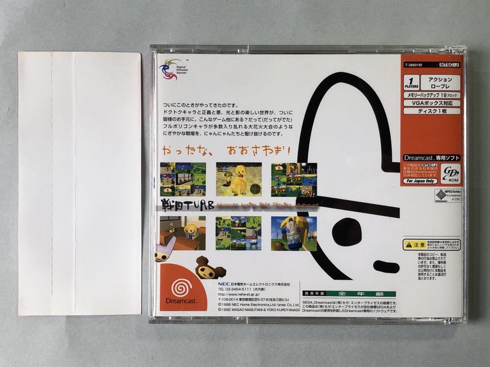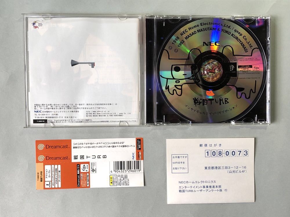 DCソフト 戦国TURB 「いろいろやっちゃおう!ちょっといいことあるかもね。」「驚異のびっくりはてなフルポリゴン多人数キャラ大戦争ロープレ」NEC です。ケースジャケットに擦れ、線傷などがあります。ディスクのデータ読み取り面に傷なく綺麗です。起動、動作確認済みです。写真のモノが全てです。新品をお探しの方や神経質な方の入札はご遠慮下さい。ノークレーム・ノーリターンで、お願いします。入札よろしくお願いいたします。 C01-90-030502