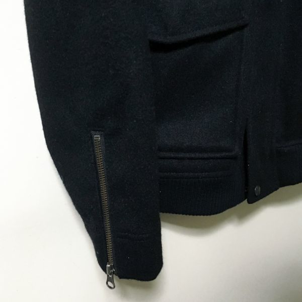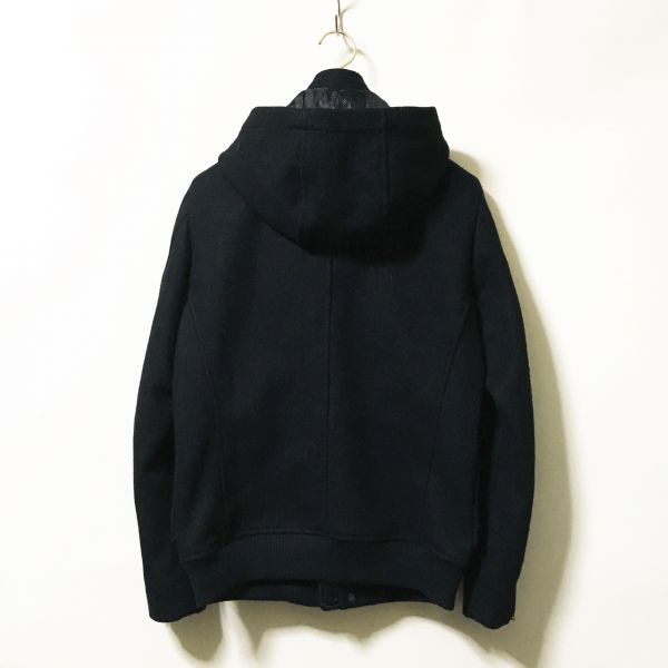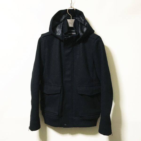 表面生地に厚手のメルトンウールを使用したしっかりとしたジャケットです。首周りのフードは取り外し可能になっており、取り外すことでスウィングトップのように使用することもできるようになっています。