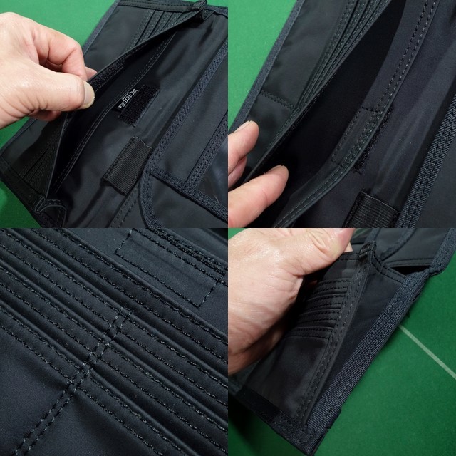 内部には札入れ2つ、カードホルダー8つ、ペンホルダー1つ、クリアスリーブ1つ、スリーブポケット1つ、L字ホルダー1つ、ベルクロ留めフリーポケット1つ。