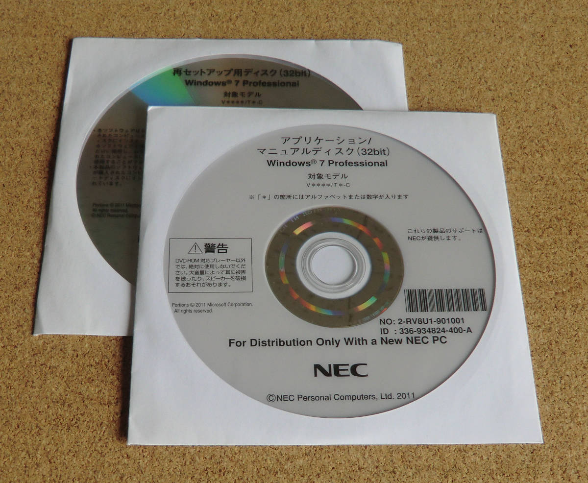 NEC VersaPro VK15W/TM-C,VK15V/TM-C,他 タブレットPC 用の再セットアップ用 ディスクとアプリケーションディスクの Windows 7 Pro 32bit リカバリセットです。 対応機種: VersaPro VK15W/TM-C, VK15V/TM-C、 VersaProJ VJ15W/TM-C, VJ15V/TM-C 【内容】 ・再セットアップ用ディスク1(32bit)Windows 7 Pro 1枚 ・アプリケーションディスク (32bit)Windows 7 Pro 1枚 以上のディスク2枚(画像の物のみ)となります。 【対応OS】 ・OSは Windows 7 Pro 32bitです。 ・メーカー純正ディスクのため、該当機種であれば、簡単にリカバリ可能です。 ・該当機種の再セットアップガイド(ダウンロード可能)に基づいてリカバリ作業を 行ってください。 【状態】 ・ディスクは未開封・未使用です。 |