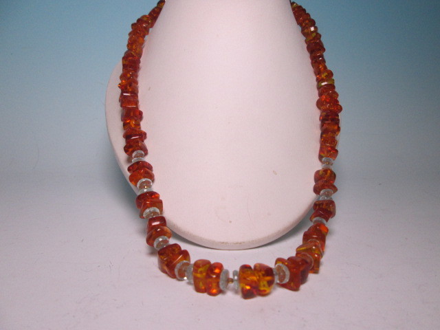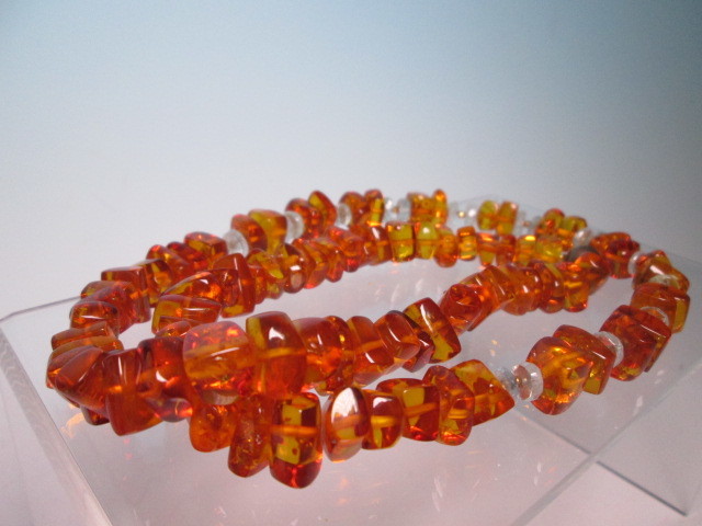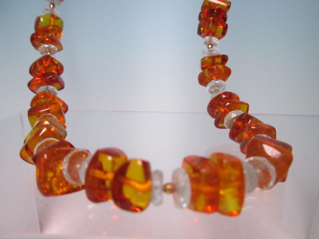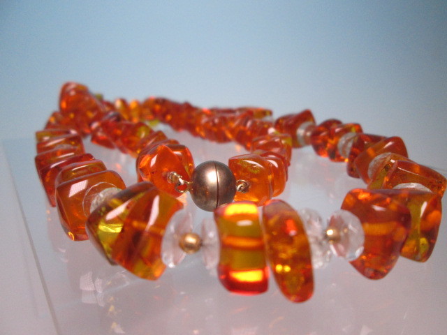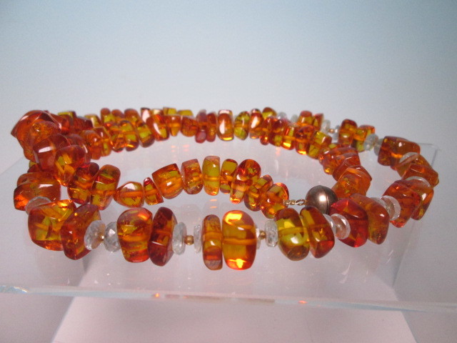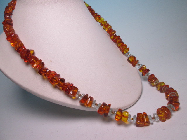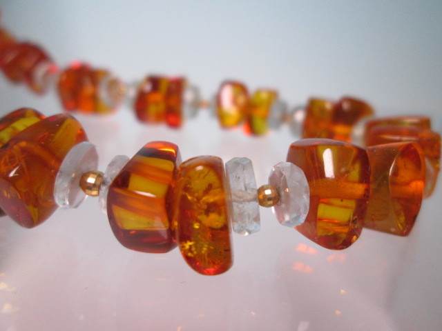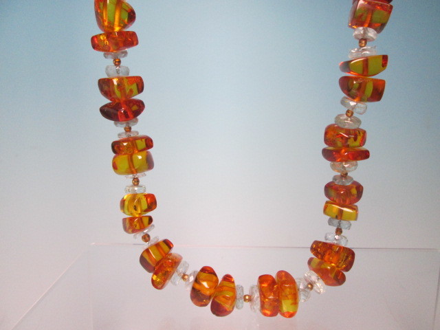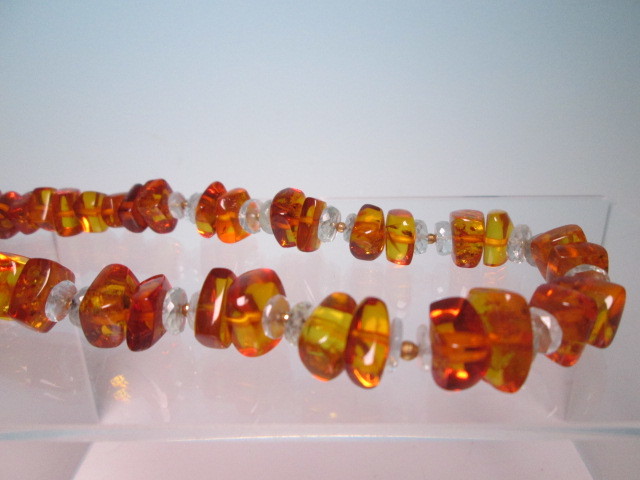 天然琥珀と淡い透明感の有る天然石のデザインネックレスです。