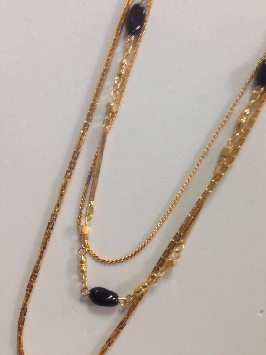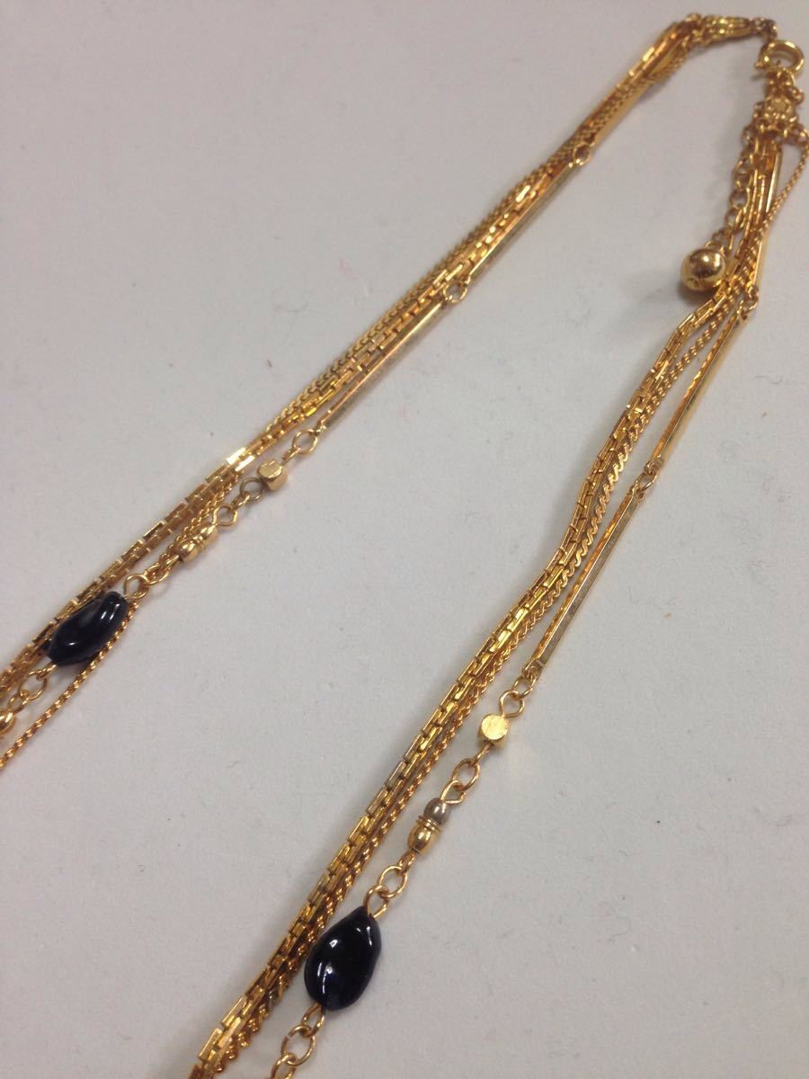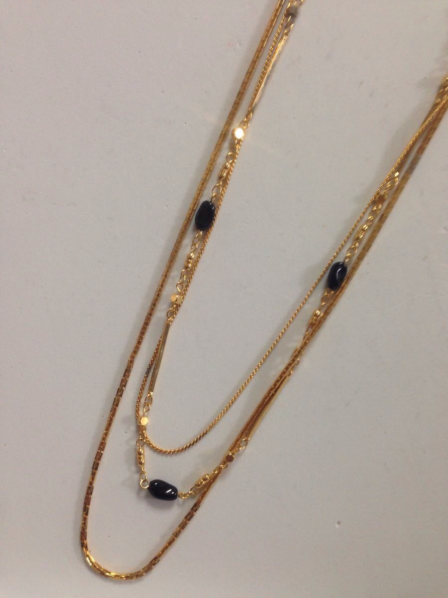 樹脂製のゴールドカラーの3連ネックレスです、ひと玉の樹脂玉は10×5ミリ、一番長い、チェーンの長さは74センチです