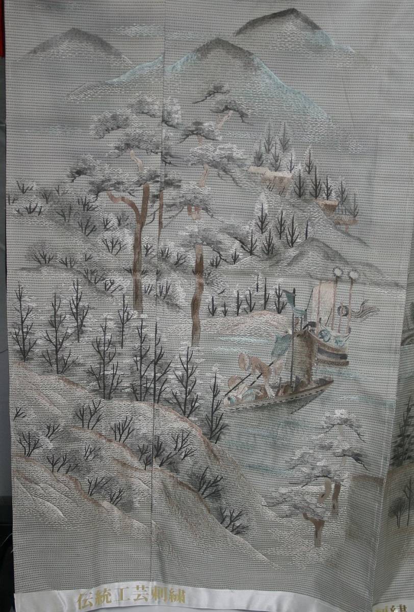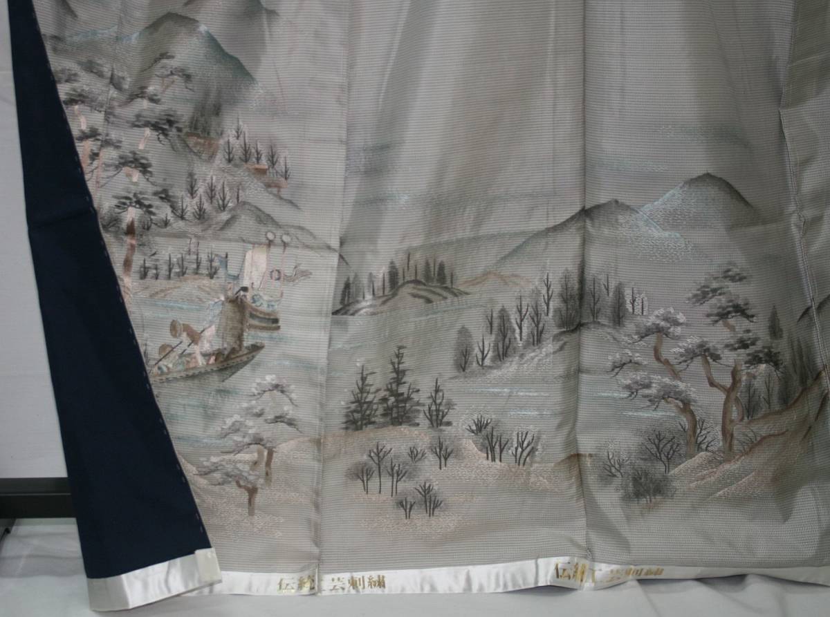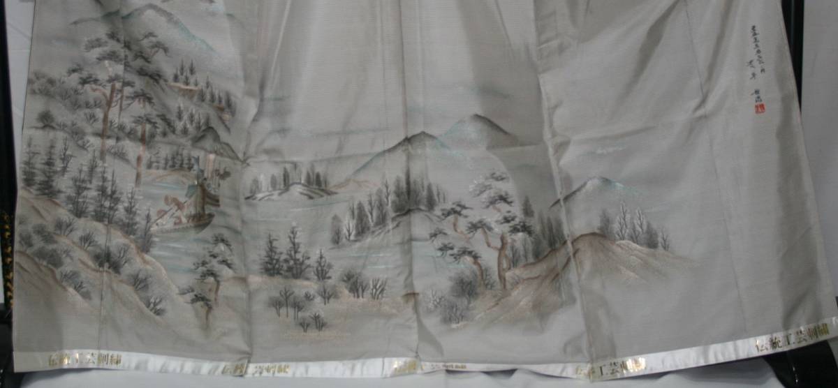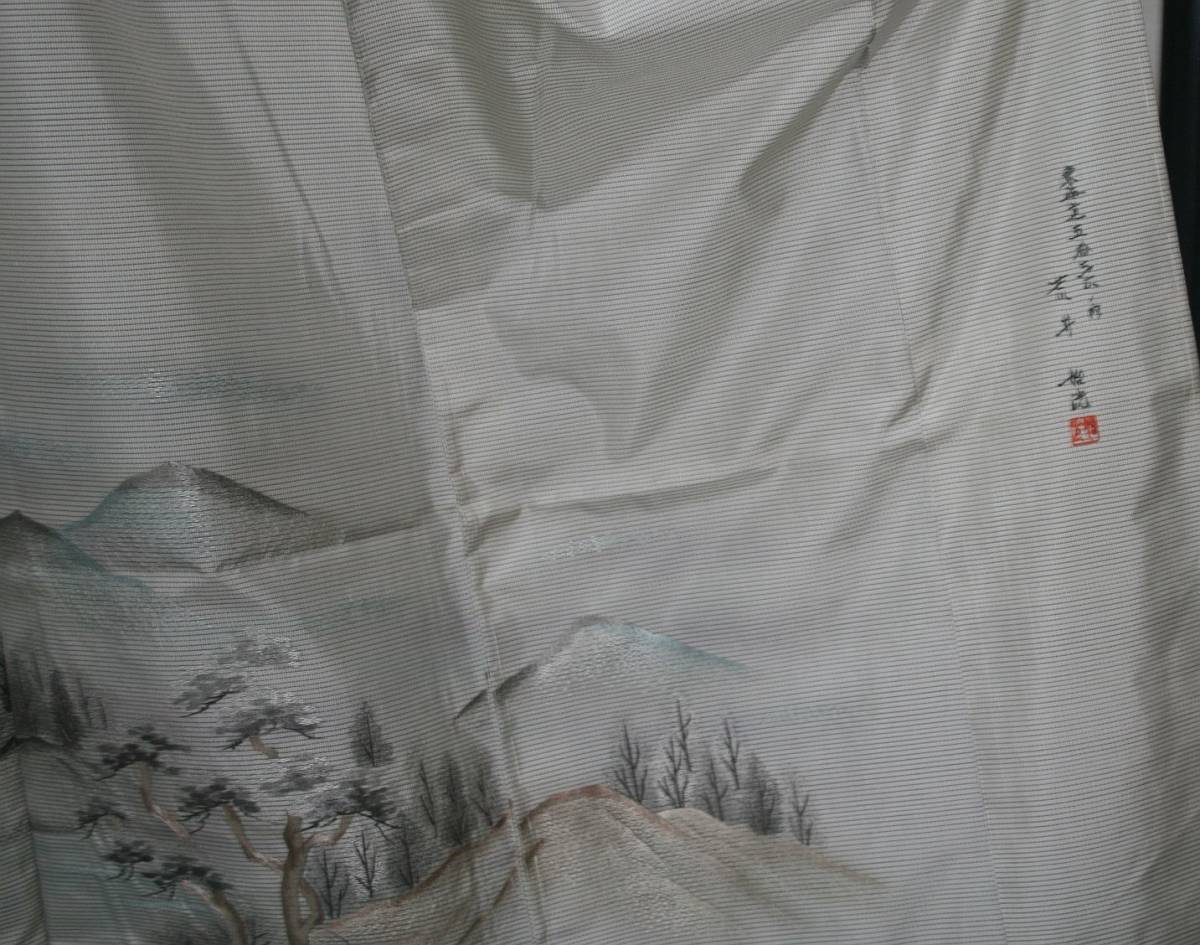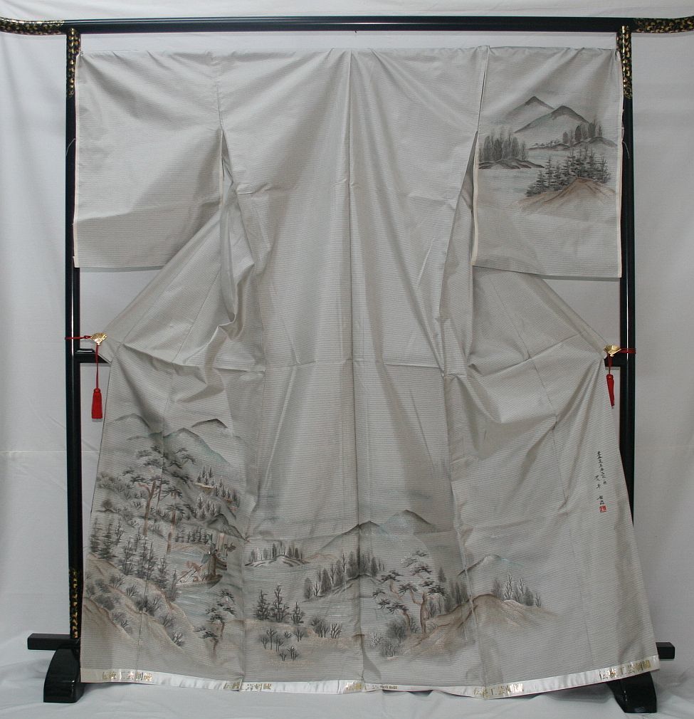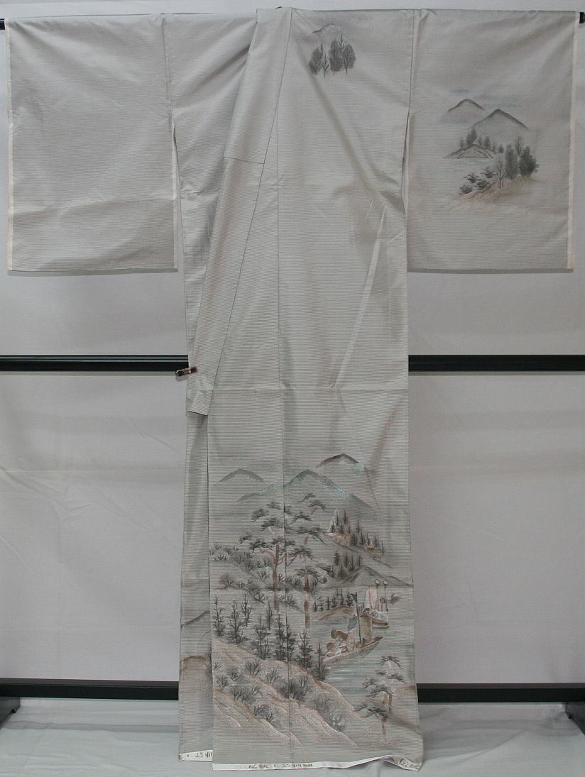 ○ごく薄いグレー地に手描き友禅作家、新井先生謹製で山水柄の古典模様の構図で