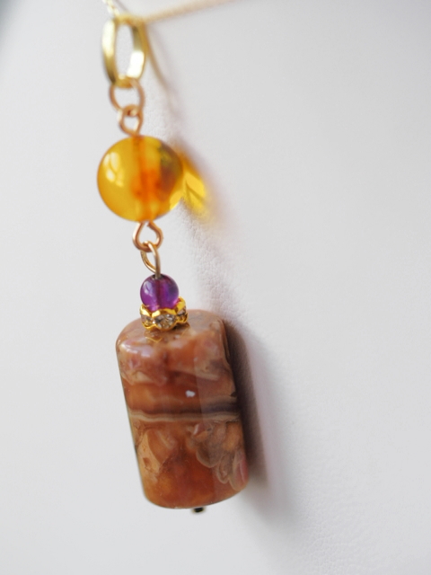 こちらはブラウンの部分とミルキーなレース模様、それにローズピンク部分のコントラストが魅力的な、バイカラーのロードクロサイトに小珠のアメジスト、カットオニキス、7.8mm琥珀丸(自然色)を組合わせたペンダントトップです