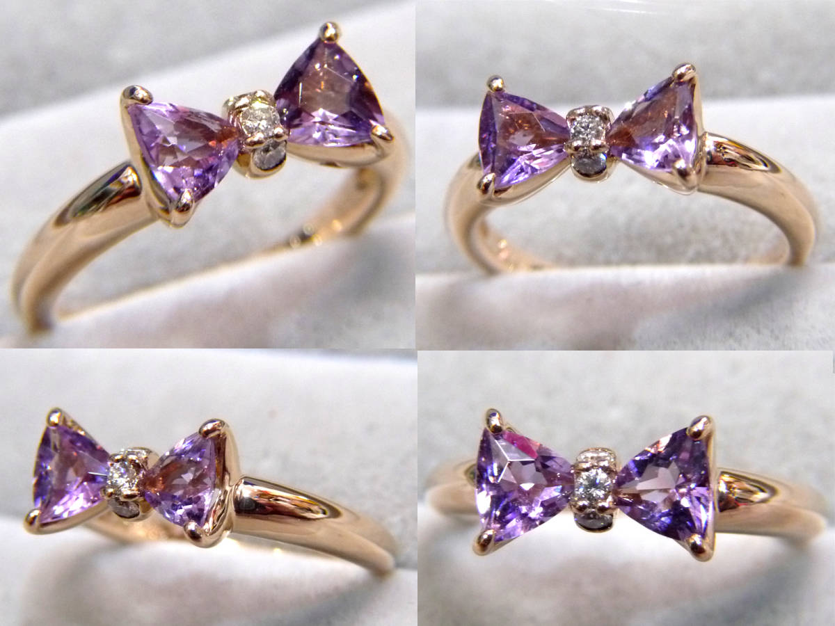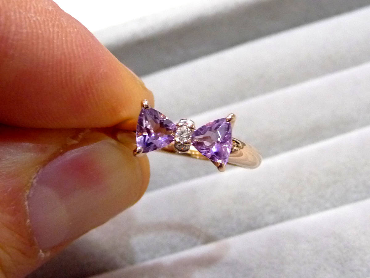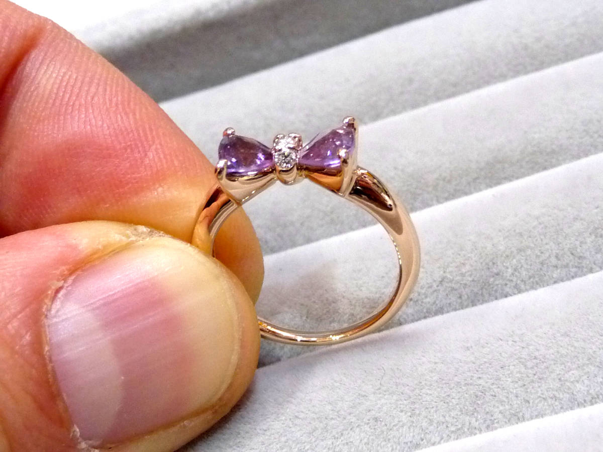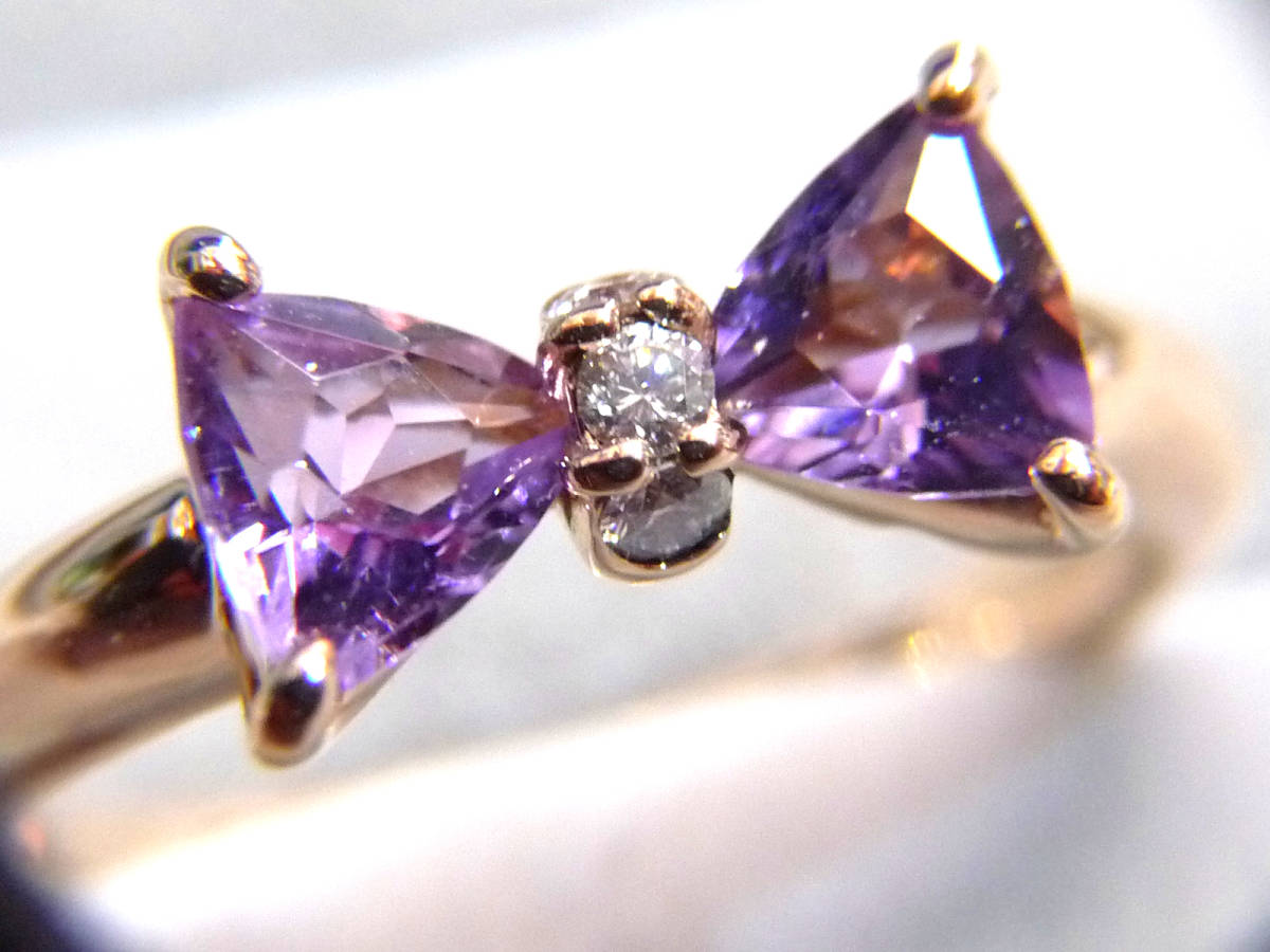 K18PG 中古美品 サイズ:7号 ダイヤ 0.05ct リボンモチーフ アメジスト 0.60ct