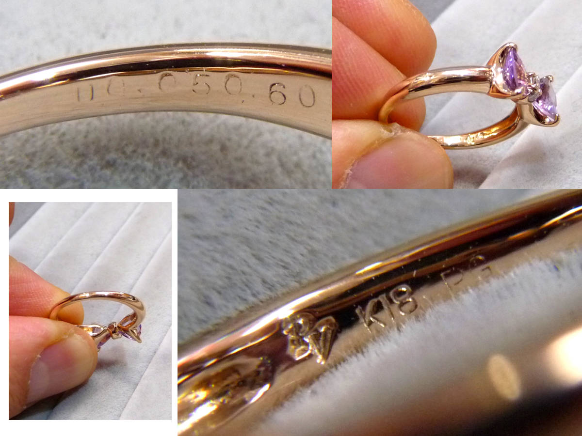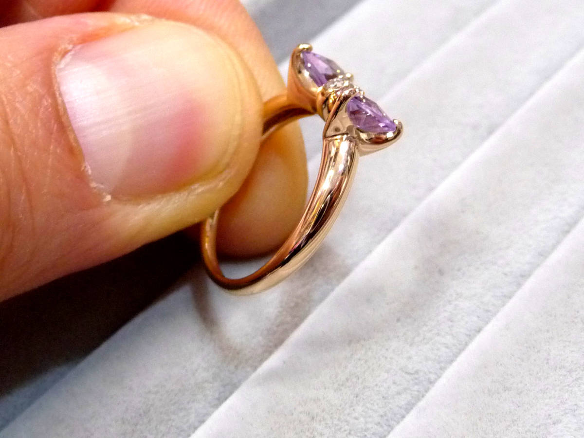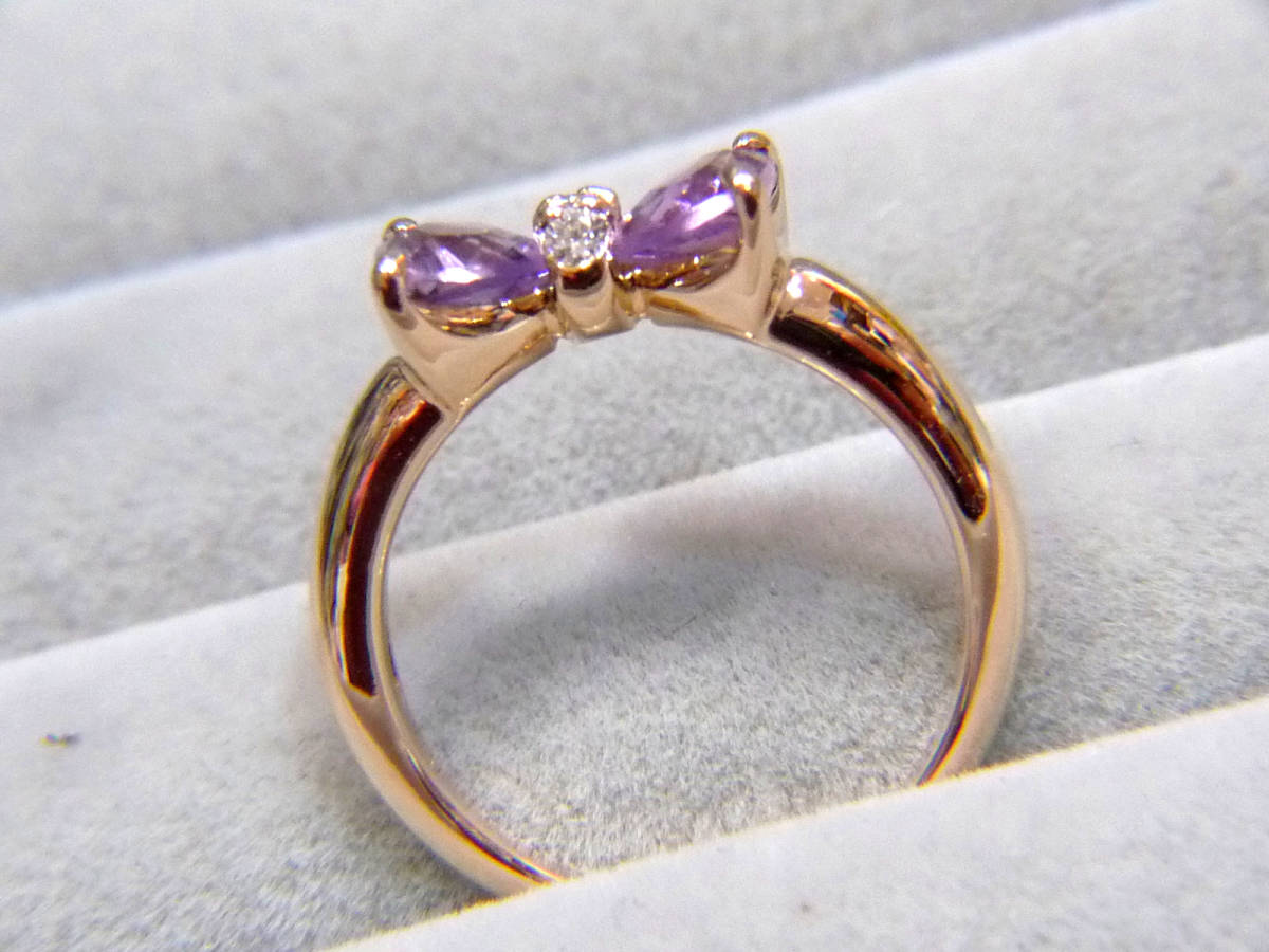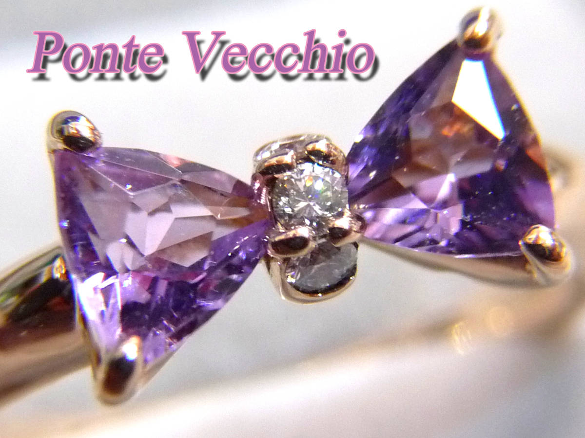 ほぼ未使用 7号 試着のみ ポンテヴェキオ 18金 ピンクゴールド 2.71g K18PG 中古美品 ダイヤ 0.05ct リボンモチーフ アメジスト 0.60c